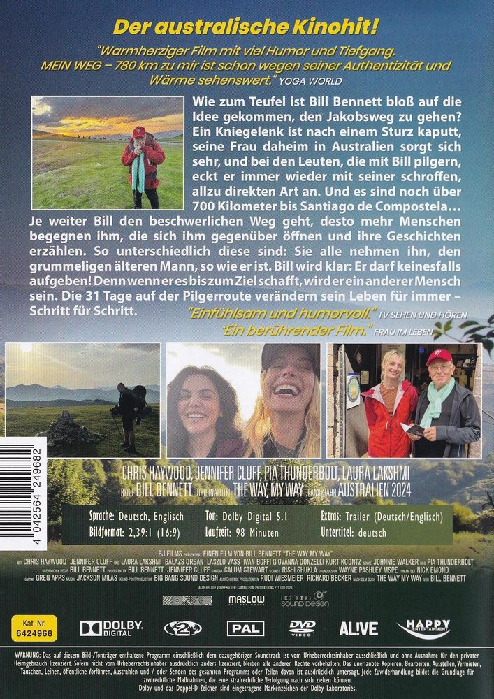 Als Produzent, Drehbuchautor und Regisseur hat Bill Bennett mit Filmen wie 'Outback - Flucht in die Wüste' und 'Kiss or Kill' Erfolge gefeiert, ist seit 40 Jahren glücklich verheiratet und nicht besonders spirituell veranlagt. Doch als er bei einem Spanienurlaub zufällig auf eine Gruppe von Pilgern trifft, lässt ihn die Begegnung nicht mehr los, und er fasst den Entschluss, selbst auf den Weg zu gehen. Im Frühjahr 2013 zieht er schließlich los. Daraus entstand der australische Bestseller 'The Way, My Way', der Bennett nun als Grundlage für das Drehbuch zu seiner Verfilmung 'Mein Weg - 780 km zu mir' (2024) diente. Zehn Jahre, nachdem er den Jakobsweg gegangen ist, kehrt Bennett zurück und verfilmt seine Reise. Er selbst wird von der australischen Kino-Legende Chris Haywood ('Quigley, der Australier', 'Muriels Hochzeit') verkörpert, die weiteren Rollen sind neben Jennifer Cluff als Jennifer, Laura Lakshmi als Rosa und Pia Thunderbolt als Cristina größtenteils mit Laiendarstellern besetzt, darunter auch einige der Pilger, die Bennett seinerzeit auf dem Weg kennen gelernt hatte. Bill Bennett produzierte den Kinofilm 'The Way, My Way' gemeinsam mit seiner Frau und langjährigen Produktionspartnerin Jennifer Cluff, die im Film auch als Bills Ehefrau Jen zu sehen ist.