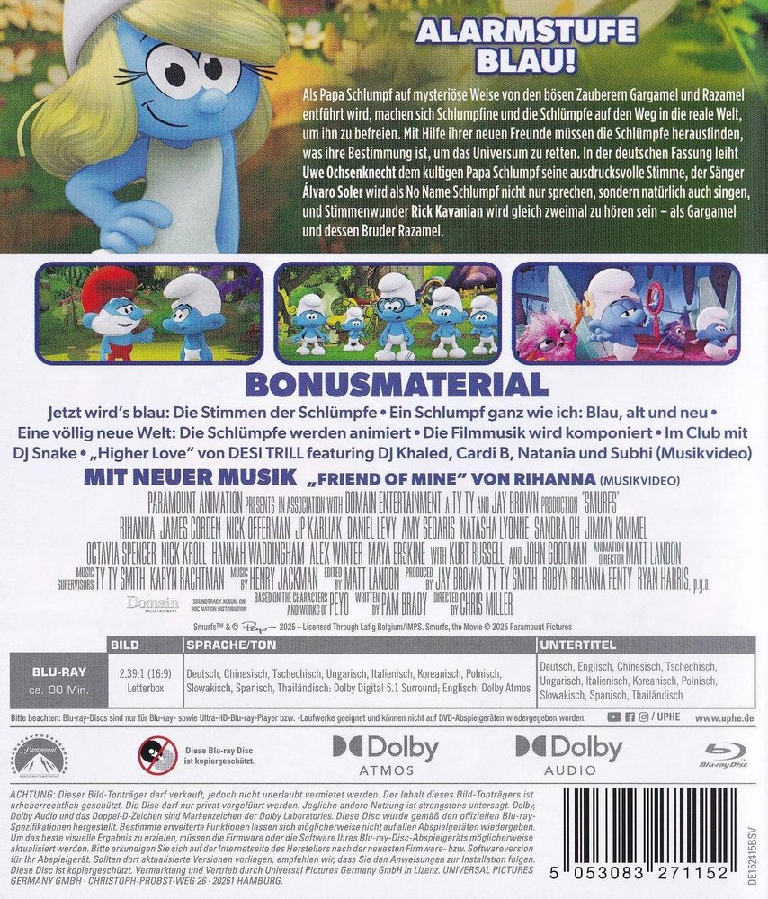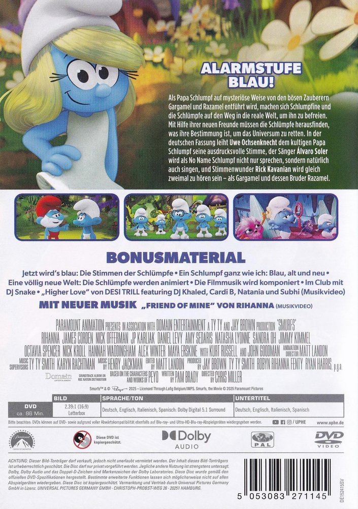 To save their world, they must come to ours! In 'The Smurfs - The Great Movie' (2025) by the directing duo Chris Miller and Matt Landon, in the German dubbing with the voices of Álvaro Soler, Rick Kavanian and Uwe Ochsenknecht, in the original English version with James Corden and Rihanna as the Smurfette, in cinemas from July 17, 2025. The film was directed by Miller and written by Pam Brady. The film was produced by Jay Brown, Ty Ty Smith, Robyn Rihanna Fenty and Ryan Harris. In the German version, Uwe Ochsenknecht lends his expressive voice to the cult Papa Smurf, the Spanish-German singer Álvaro Soler will not only speak, but of course also sing as No Name Schlumpf, and voice miracle Rick Kavanian can be heard twice - as Gargamel and his brother Razamel. In the original English version, 'Smurfs: Smurf It Up' features a star-studded cast including Rihanna, James Corden, Nick Offerman, JP Karliak, Dan Levy, Amy Sedaris, Natasha Lyonne, Sandra Oh, Octavia Spencer, Nick Kroll, Hannah Waddingham, Alex Winter, Billie Lourd, Xolo Maridueña, Kurt Russell and John Goodman.