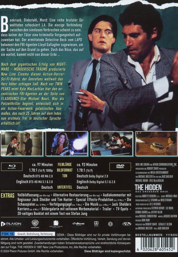 Nach dem gigantischen Erfolg von 'Nightmare - Mörderische Träume' produzierte das Studio 'New Line Cinema' den Action-Horror-Sci-Fi-Hybrid 'The Hidden - Das unsagbar Böse' (1987) unter der Regie von Jack Sholder, der Genrefans weltweit das Herz höher schlagen ließ. Noch vor der Kultserie 'Twin Peaks' mimt Kyle MacLachlan hier den exzentrischen FBI-Agenten an der Seite von 'Flashdance' Star Michael Nouri und Ed O'Ross als Cliff Willis. Was als Polizeithriller beginnt, entwickelt sich in ein Action-Feuerwerk galaktischen Ausmaßes, das nach 25 Jahren auf dem Index nun erstmals frei in deutscher Sprache erhältlich ist.