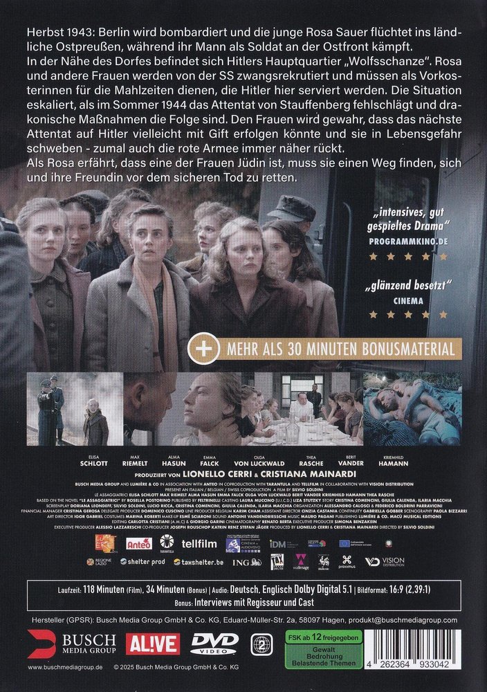 'Die Vorkosterinnen' alias 'Le assaggiatrici' (2025), ein packendes, bisher unbeleuchtetes Kapitel des Zweiten Weltkriegs, inszeniert von Regisseur Silvio Soldini ('Brot und Tulpen') mit Elisa Schlott, Alma Hasun und Max Riemelt. 'Die Vorkosterinnen' ist in Deutschland ab 29. Mai 2025 bundesweit im Kino zu erleben.