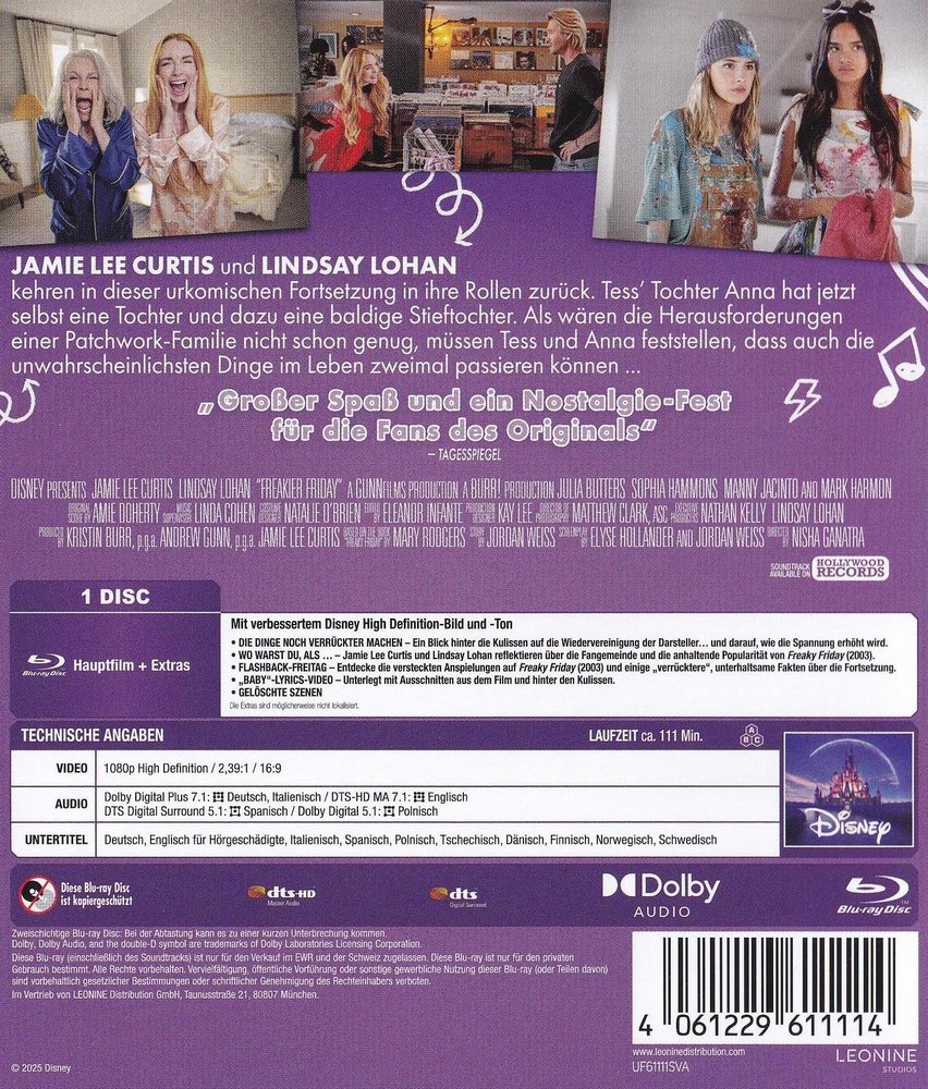 Disney's fantasy comedy 'Freakier Friday' (2025) was directed by Nisha Ganatra, starring Lindsay Lohan as Anna Coleman and Jamie Lee Curtis as Tess Coleman. In addition, Mark Harmon as Ryan, Chad Michael Murray as Jake, Christina Vidal Mitchell, Haley Hudson, Lucille Soong, Stephen Tobolowsky and Rosalind Chao return to their old roles, with Julia Butters, Sophia Hammons, Manny Jacinto and Maitreyi Ramakrishnan returning to the cast. The feature film was produced by Kristin Burr, Andrew Gunn and Curtis. Nathan Kelly, Ann Marie Sanderlin and Lohan served as executive producers. The theatrical release in Germany will take place on August 7, 2025.