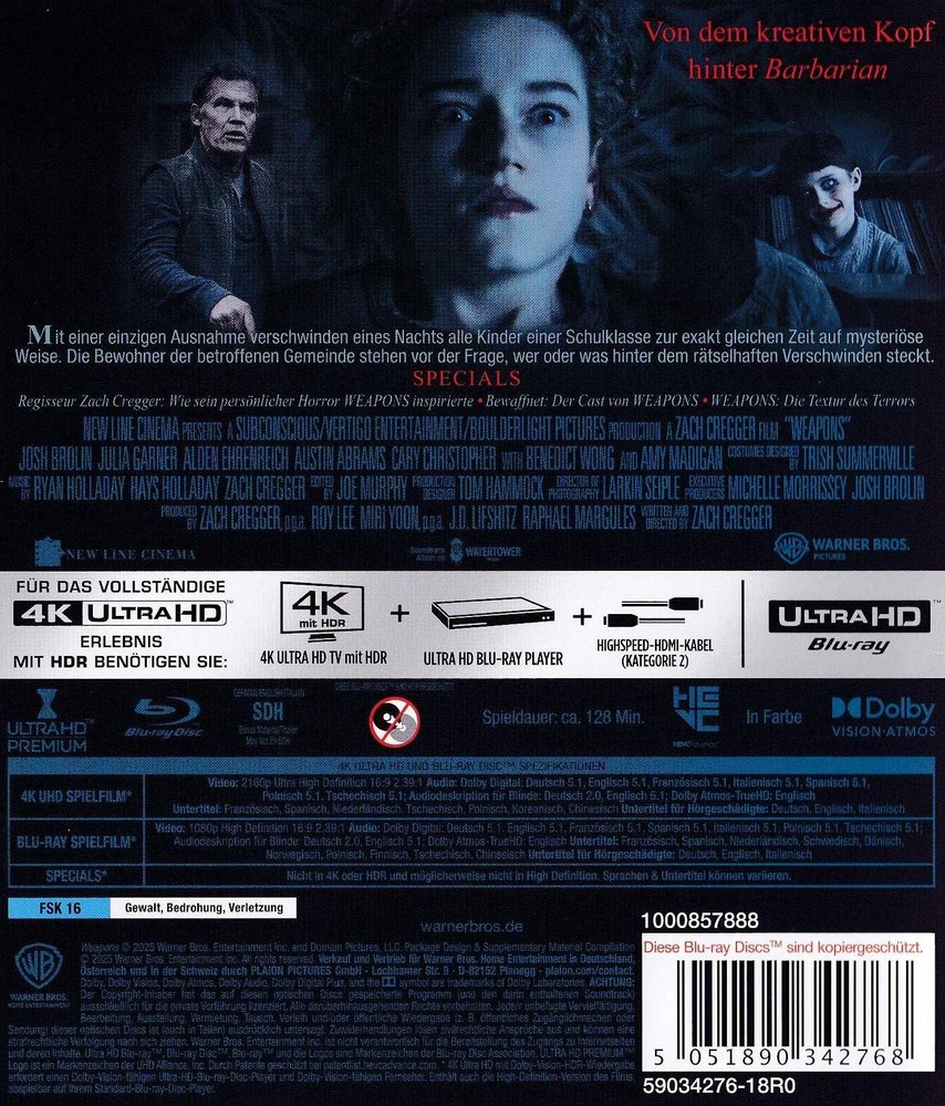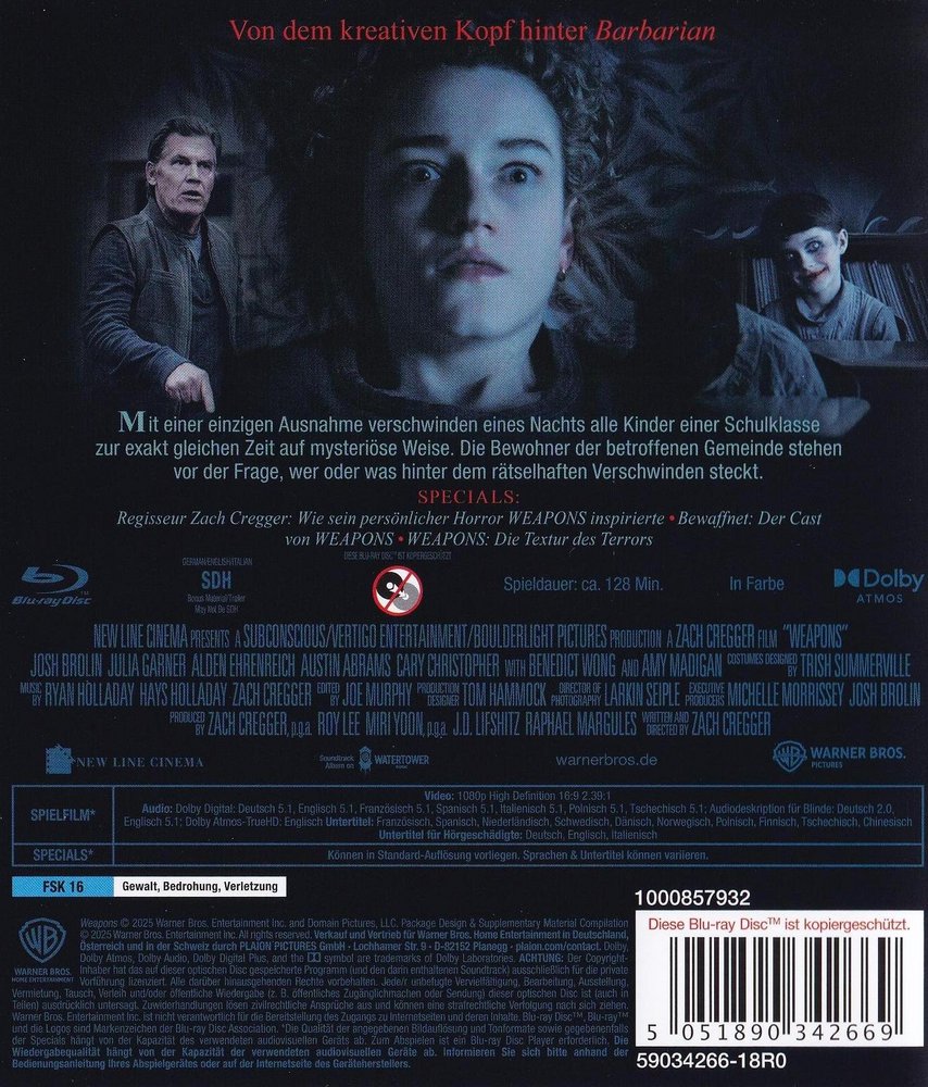 With 'Weapons' (2025), 'New Line Cinema' and Zach Cregger, the creative mind behind 'Barbarian', present a horror epic with several stories about the disappearance of high school students in a small town. The cast of the film includes Josh Brolin, Julia Garner, Alden Ehrenreich, Austin Abrams, Cary Christopher, Benedict Wong and Amy Madigan. Cregger directed 'Weapons' from his own screenplay. He produced the film with Roy Lee, Miri Yoon, J.D. Lifshitz and Raphael Margules. Michelle Morrissey and Brolin were responsible for the executive production. The filmmaker's creative team included cinematographer Larkin Seiple, production designer Tom Hammock, editor Joe Murphy and costume designer Trish Summerville. The film music was written by Ryan Holladay, Hays Holladay and Cregger himself. The studio 'Warner Bros. Pictures' took over the distribution, and the release in cinemas and IMAX cinemas will take place in Germany on August 7, 2025.