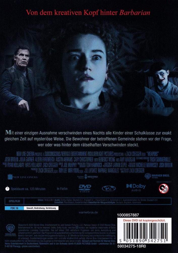 Mit 'Weapons - Die Stunde des Verschwindens' (2025) präsentieren 'New Line Cinema' und Zach Cregger, der kreative Kopf hinter 'Barbarian', ein Horror-Epos mit mehreren Geschichten über das Verschwinden von High-School-Schülern in einer Kleinstadt. Zur Besetzung des Films gehören Julia Garner als Justine Gandy, Josh Brolin als Archer Graff, Alden Ehrenreich als Paul Morgan, Benedict Wong als Marcus, Amy Madigan als Gladys Lilly, Callie Schuttera als Mrs. Lilly, June Diane Raphael als Donna Morgan, Austin Abrams als James, Whitmer Thomas als Mr. Lilly, Toby Huss als Captain Ed und Cary Christopher als Alex Lilly. Regie bei 'Weapons' führte Cregger nach seiner eigenen Drehbuchvorlage. Zusammen mit Roy Lee, Miri Yoon, J.D. Lifshitz und Raphael Margules produzierte er den Film. Für die ausführende Produktion zeichneten Michelle Morrissey und Brolin verantwortlich. Zum kreativen Team des Filmemachers gehörten Kameramann Larkin Seiple, Produktionsdesigner Tom Hammock, Editor Joe Murphy und Kostümdesignerin Trish Summerville. Die Filmmusik schrieben Ryan Holladay, Hays Holladay und Cregger selbst. Den Vertrieb übernahm das Studio 'Warner Bros. Pictures', die Veröffentlichung in Kinos und IMAX-Filmtheatern findet in Deutschland am 7. August 2025 statt.
