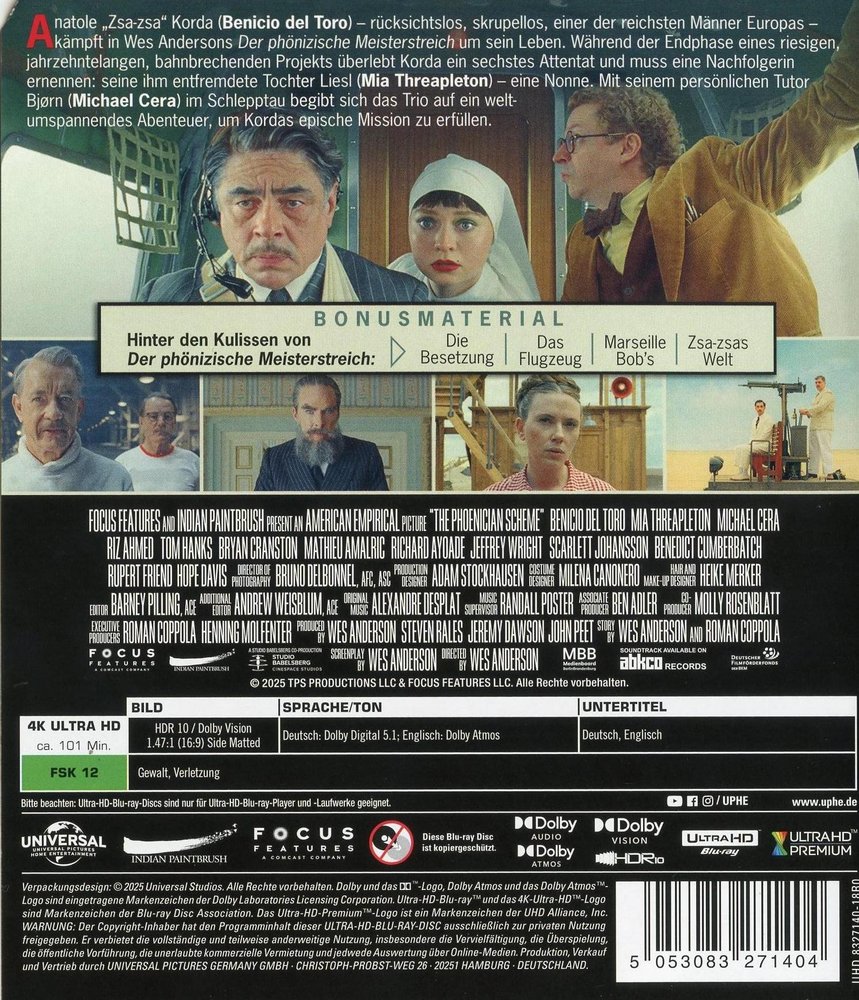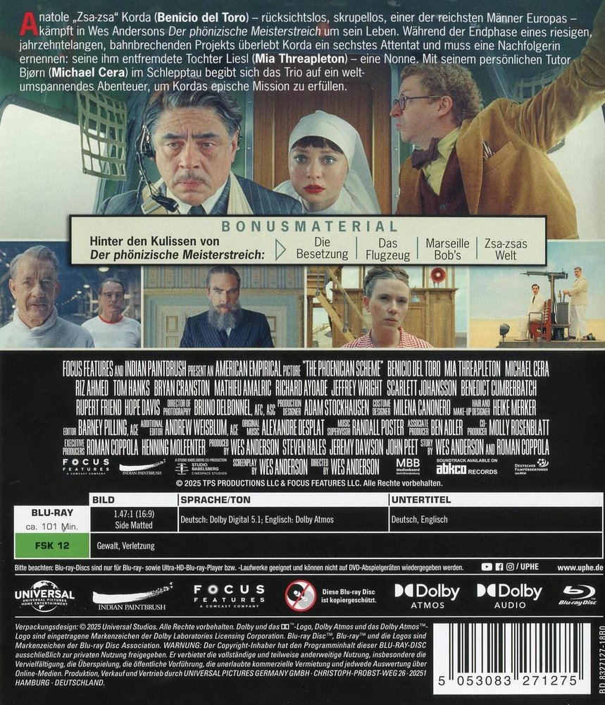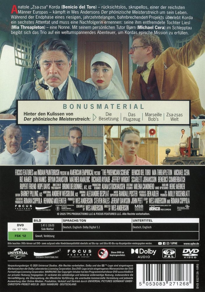 In 'The Phoenician Scheme - Der Phönizische Meisterstreich' (2025) erzählt Regisseur Wes Anderson die Geschichte einer Familie und eines Familienunternehmens, starbesetzt mit Benicio del Toro als Zsa-Zsa Korda, einem der reichsten Männer Europas, Mia Threapleton als Liesl, seine Tochter und Nonne, Michael Cera als Björn, ihr Lehrer, außerdem Tom Hanks, Bryan Cranston, Mathieu Amalric, Riz Ahmed, Richard Ayoade, Jeffrey Wright, Scarlett Johansson, Benedict Cumberbatch, Rupert Friend und Hope Davis in der Geschichte einer Familie und eines Familienunternehmen. Die Weltpremiere feierte Andersons Ensemblekomödie einmal mehr bei den Internationalen Filmfestspielen von Cannes, wo 'The Phoenician Scheme' im Wettbewerb um die 'Goldene Palme' konkurrierte. In der Produktion gefördert durch den Deutschen Filmförderfonds und das Medienboard Berlin-Brandenburg, wurde der Film vom Studio Babelsberg mitproduziert und dort auch gedreht. Neben dem erstklassigen Cast konnte sich Oscar-Gewinner Anderson wieder auf bewährte Mitstreiter verlassen, darunter Co-Autor Roman Coppola und der Oscar-prämierte Komponist Alexandre Desplat. Für die Bildgestaltung tat sich der US-Regisseur erstmals mit dem Oscar-nominierten Kameramann Bruno Delbonnel ('Die fabelhafte Welt der Amélie') zusammen, zum Kinostart in Deutschland am 29. Mai 2025.