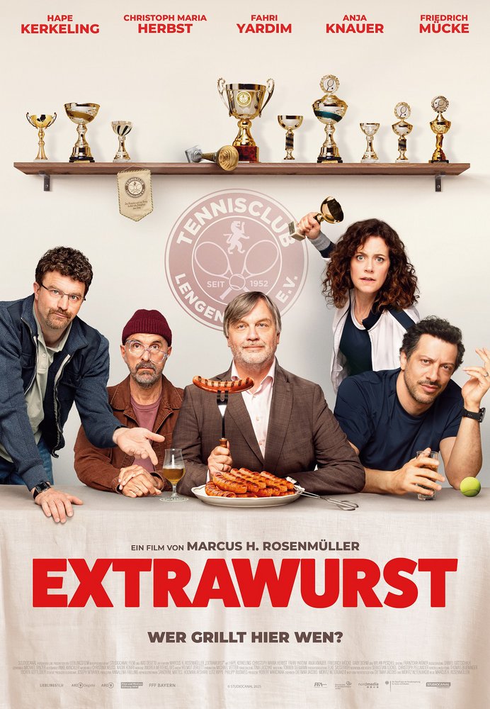 The last item on the agenda at the club meeting of a tennis club, a vote is to be taken on a new grill. This is the starting point for one of the funniest and most successful plays of recent years. Here follows the feature film adaptation, with Hape Kerkeling ('Der Boandlkramer und die ewige Liebe'), Christoph Maria Herbst ('Der Buchspazierer'), Fahri Yardim ('jerks.'), Anja Knauer ('Pumuckl und das große Missverständnis') and Friedrich Mücke ('Wunderschön') as well as Gaby Dohm ('Das Traumschiff', 'Die Schwarzwaldklinik') brilliantly cast. Prejudices, everyday racism, religion - in this fast-paced culture-clash comedy, all sides get their fat. Director Marcus H. Rosenmüller ('Trautmann', 'Beckenrand Sheriff', 'Pumuckl and the Great Misunderstanding') staged the ravishingly evil satire in North Rhine-Westphalia until the end of May 2025. The theatrical release in Germany is reached on January 15, 2026. The play 'Extrawurst' had enjoyed great success nationwide in the years leading up to this cinema adaptation and became the most performed play in Germany in the 2021/2022 season. The theatre hit by comedy writers Dietmar Jacobs ('Stromberg', 'Pastewka') and Moritz Netenjakob ('Stromberg', 'Ladykracher'), which was celebrated by audiences and critics, has now been filmed for the cinema with a great ensemble of actors. 'Extrawurst' (2025) is a production of 'LIEBLINGSFILM' (see 'Rubinrot', 'Beckenrand Sheriff', 'Trautmann') and 'STUDIOCANAL' ('Woodwalkers', 'Der Buchspazierer') in co-production with 'ARD Degeto Film' and was funded by the Film- und Medienstiftung NRW, the Filmförderungsanstalt FFA, the FilmFernsehFonds Bayern and Nordmedia.