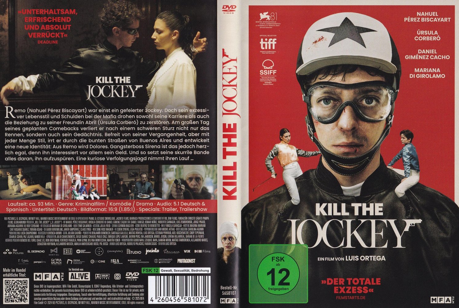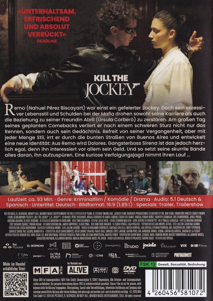 Regisseur Luis Ortega (siehe auch 'Der schwarze Engel' 2018 produziert von Pedro Almodóvar) inszenierte mit 'Kill the Jockey' alias 'El jockey' (2024) einen surrealen Mix aus Mafia-Thriller und absurder Tragikomödie - irgendwo zwischen Wes Andersons akribischer Ästhetik und Giorgios Lanthimos' schrägem Existenzialismus. Mit der unverkennbaren Bildsprache von Kaurismäkis Stamm-Kameramann Timo Salminen, den brillanten Performances von Nahuel Pérez Biscayart ('Persischstunden', '120 BPM') als Remo Manfredini, Úrsula Corberó ('Haus des Geldes', 'The Day of the Jackal') als Abril, Daniel Giménez Cacho als Sirena, Mariana Di Girólamo als Ana, Daniel Fanego als Fanego, Adriana Aguirre als Mujer Mística, Osmar Núñez als Luis, Roberto Carnaghi als Oscar, Luis Ziembrowski als Enrique sowie seinem einzigartigen Stil und Humor, ist 'Kill the Jockey' eine extravagante Ode an den Neuanfang. Der Film feierte Weltpremiere im Wettbewerb der 82. Filmfestspiele von Venedig und war der argentinische Beitrag für die 'Oscars' 2025. Der Kinostart in Deutschland ist am 18. September 2025 erreicht.