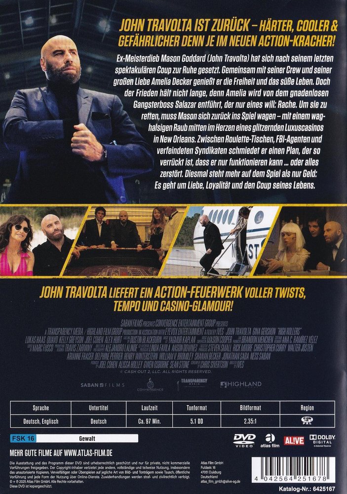 In the heist movie sequel 'Cash Out 2 - High Rollers' (2025), starring John Travolta as Mason Goddard, Gina Gershon as Amelia Decker, Lukas Haas as Shawn Goddard, Danny Pardo as Salazar, Quavo as Anton, Natali Yura as Link, Noel Gugliemi as Hector, Swen Temmel as Caras and Demián Castro as Zade Black directed by Randall Emmett, at the US theatrical release on March 14, 2025.