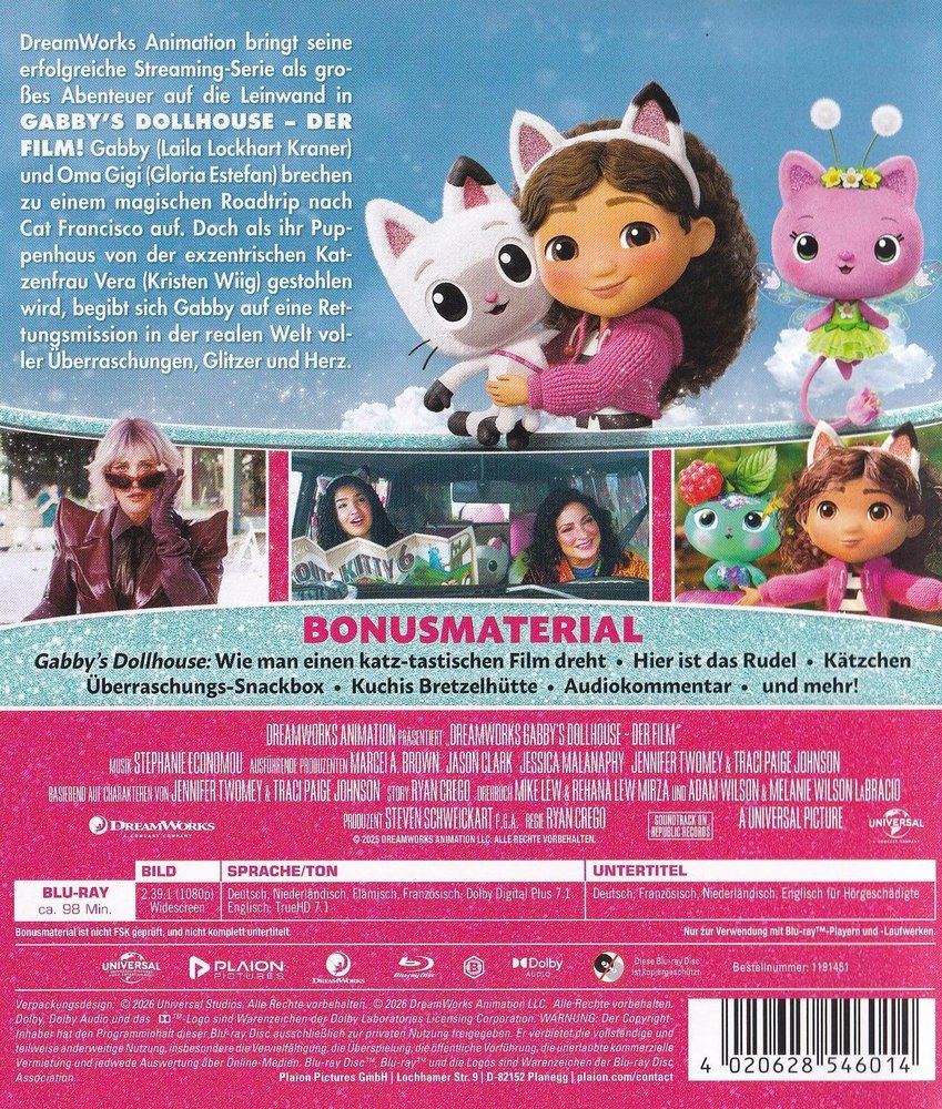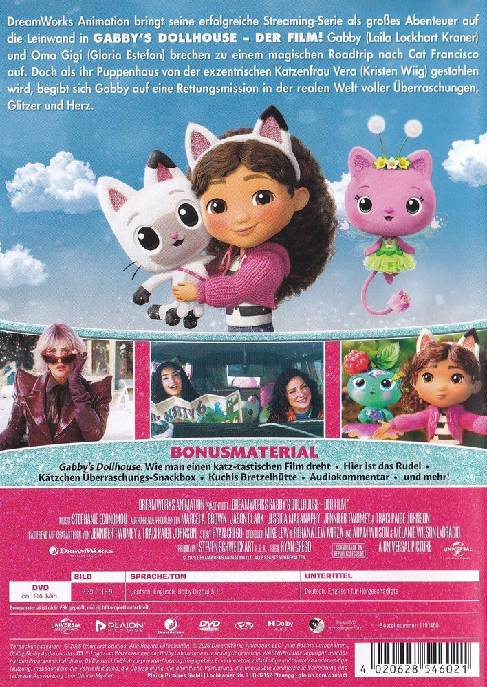 Mit 'Gabby's Dollhouse - Der Film' bringt DreamWorks-Animation die weltweit erfolgreiche Serie für ein erstes, miaufregendes Kinoabenteuer endlich auf die Leinwand. Dabei erlebt Gabby (Laila Lockhart Kraner) ein katztastisches Abenteuer. Bei einem Roadtrip mit ihrer Großmutter Gigi (Gloria Estefan) in Richtung 'Katz Francisco' gerät ihr über alles geliebtes, kunterbuntes Puppenhaus in die Pfoten der exzentrischen Katzenliebhaberin Vera (die Oscar-nominierte Kristen Wiig). Schnell muss Gabby all ihre cleveren Kätzchen zusammentrommeln, um mit Hilfe der kleinen Freunde ihren kostbarsten Besitz zu retten...
