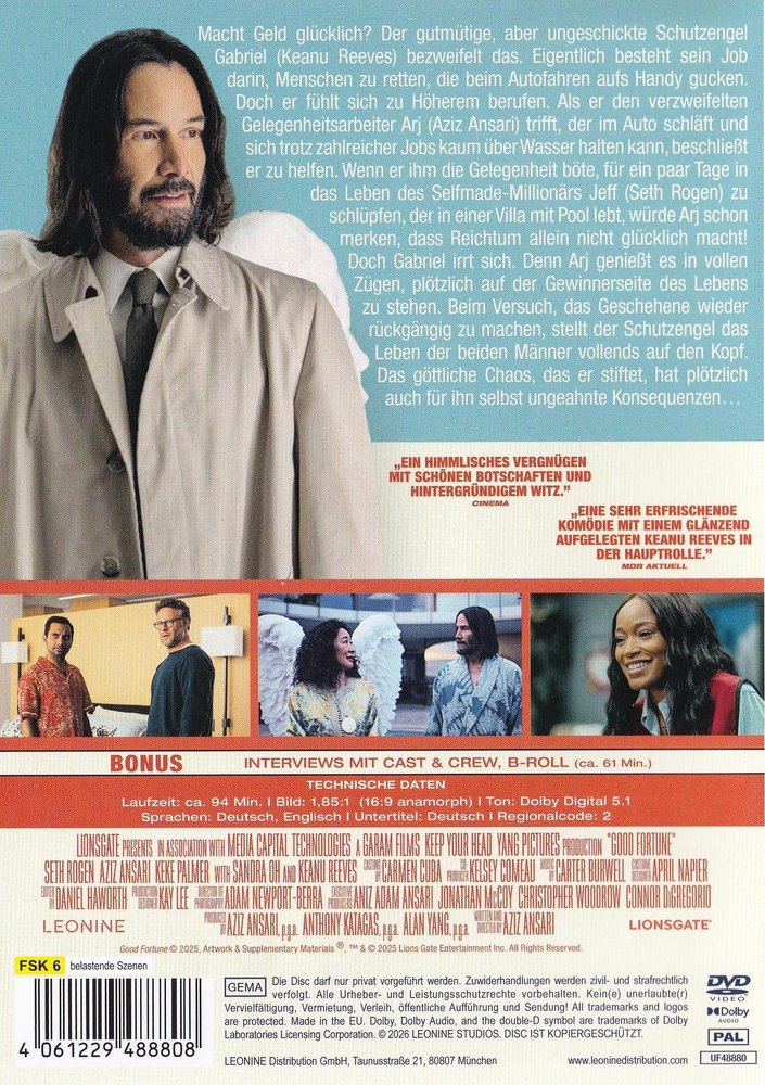 In 'Good Fortune', a well-meaning but rather incompetent angel named Gabriel (Keanu Reeves) interferes in the life of a gig worker struggling to survive and that of a wealthy venture capitalist: Does money make you happy? The good-natured but clumsy guardian angel Gabriel doubts this. Actually, his job is to rescue people who are looking at their cell phones while driving. But he feels called to higher things. When he meets the desperate casual worker Arj, who sleeps in the car and can barely keep his head above water despite numerous jobs, he decides to help. If he offered him the opportunity to slip into the life of self-made millionaire Jeff (Seth Rogen), who lives in a villa with a pool, for a few days, Arj would realize that wealth alone does not make you happy. But Gabriel is wrong. Because Arj enjoys it to the fullest to suddenly be on the winning side of life. In an attempt to undo what has happened, the guardian angel turns the lives of the two men completely upside down. The divine chaos he causes suddenly has unforeseen consequences for himself as well...