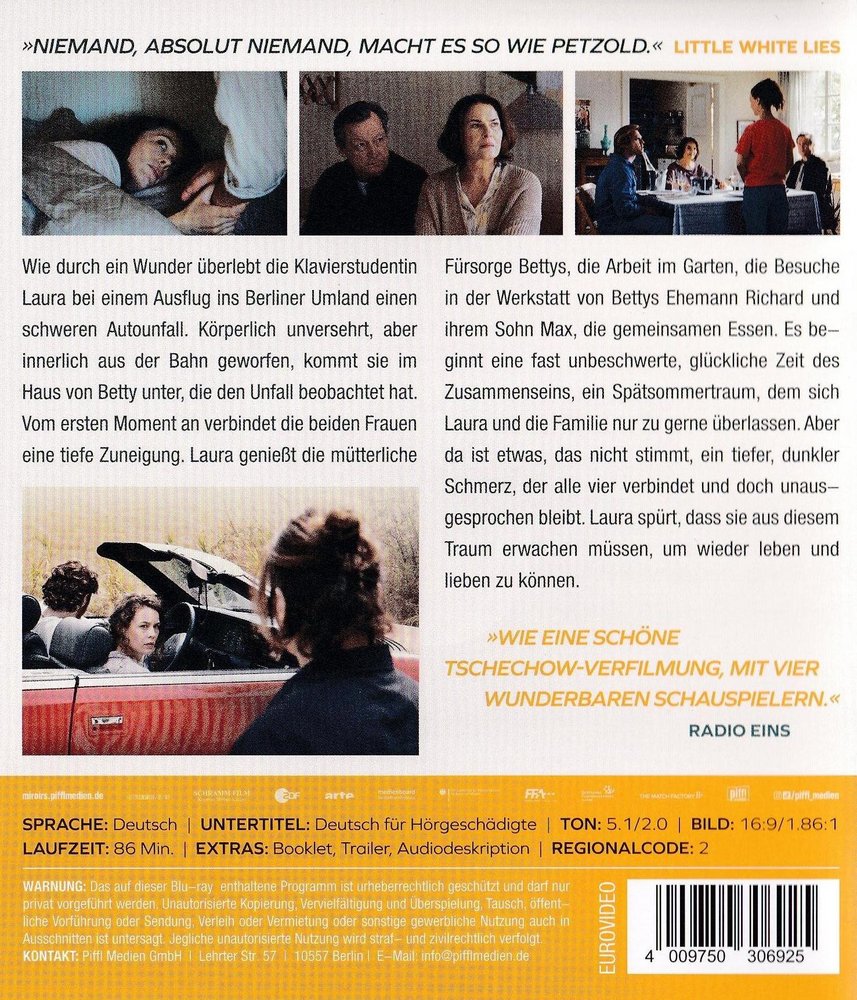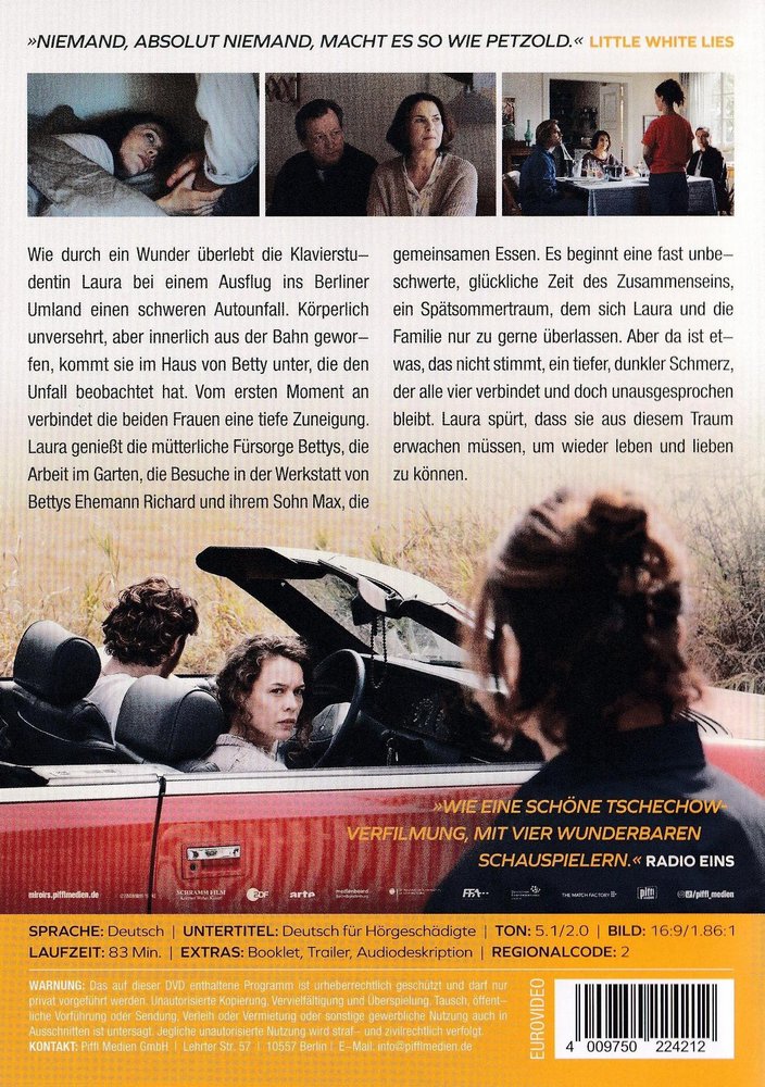 Miraculously, piano student Laura (Paula Beer) survives a serious car accident during a trip to the Berlin countryside. Physically unharmed, but inwardly thrown off track, she finds shelter in the house of Betty (Barbara Auer), who witnessed the accident. From the first moment, the two women are connected by a deep affection. Laura enjoys Betty's maternal care, the work in the garden, the visits to the workshop of Betty's husband Richard (Matthias Brandt) and her son Max (Enno Trebs), the meals together. An almost carefree, happy time of being together begins, a late summer dream to which Laura and the family are only too happy to abandon themselves. But there is something that is not true, a deep, dark pain that connects all four and yet remains unspoken. Laura feels that they have to wake up from this dream in order to be able to live and love again.