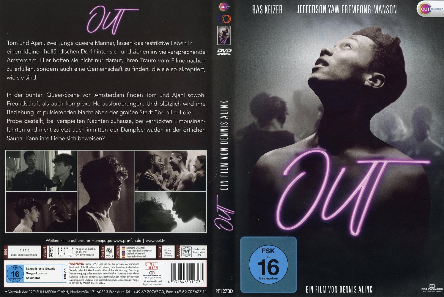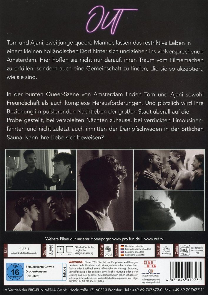 'Out' (2024) is more than just a story about self-discovery, it's an intimate look at the struggle for self-acceptance against the backdrop of a new environment. As they wrestle with the question of who they are and where they belong, Tom and Ajani must decide whether the city will bring them closer together or drive them apart. A fun-loving film with Bas Keizer as Tom, Jefferson Yaw Frempong-Manson as Ajani, Fjodor Jozefzoon as Fernando, Robbert Rodenburg as Julian, André Manuel as Tom's father, Henry van Loon as Zen, Victor Löw as Arthur and Diron Sterk, Jari Hellegers, by and with director Dennis Alink about love, identity and the search for one's own place in the world.