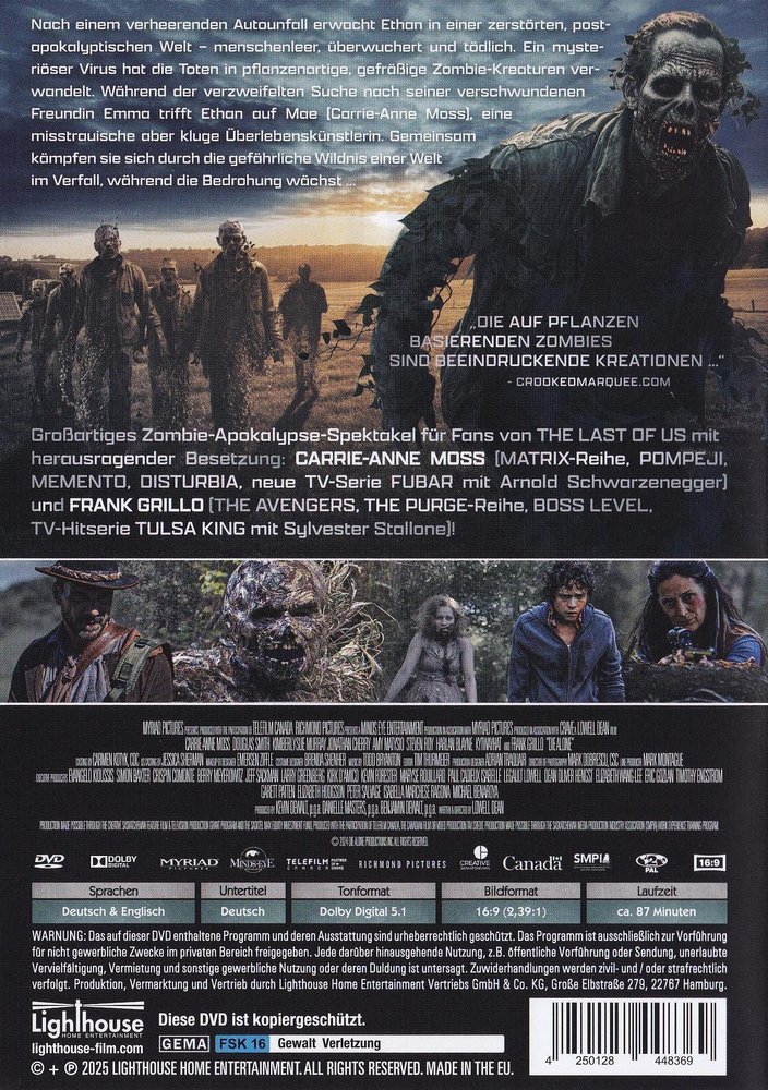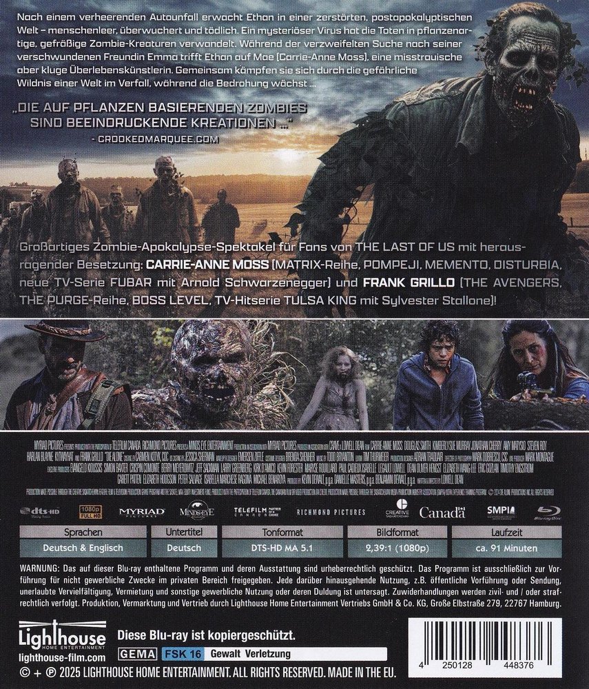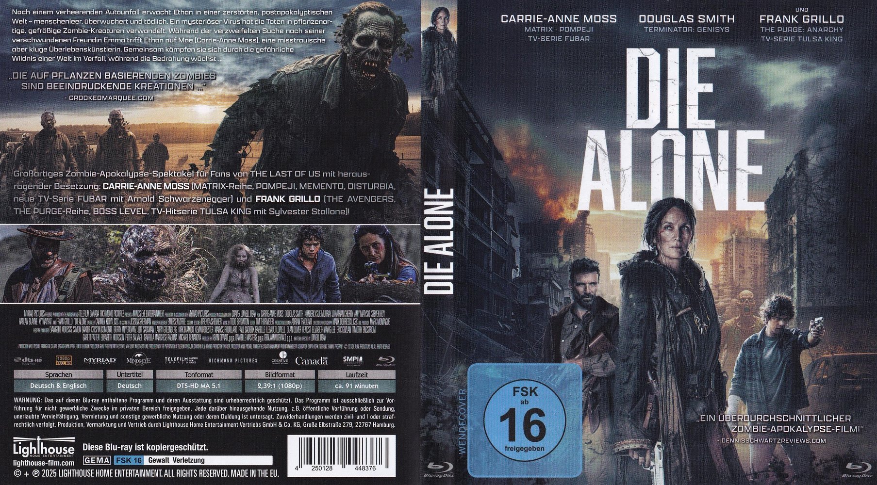 In 'Die Alone' (2024) mit Carrie-Anne Moss als Mae, Frank Grillo als Kai, Douglas Smith als Ethan, Kimberly-Sue Murray als Emma, Jonathan Cherry als Tom, Amy Matysio als Jolene, Steven Roy als 'The Wolf', Harlan Blayne Kytwayhat als 'The Fox', Sari Mercer als Sara, Leo Fafard als Jäger und Laura Abramsen unter der Regie von Lowell Dean. Ein Zombie-Apokalypse-Spektakel im Stil von 'The Last of Us' mit herausragender Besetzung und dem Gewinn mehrerer Horror-Festivals, u.a. dem Helifax Canadian-Screen-Award.