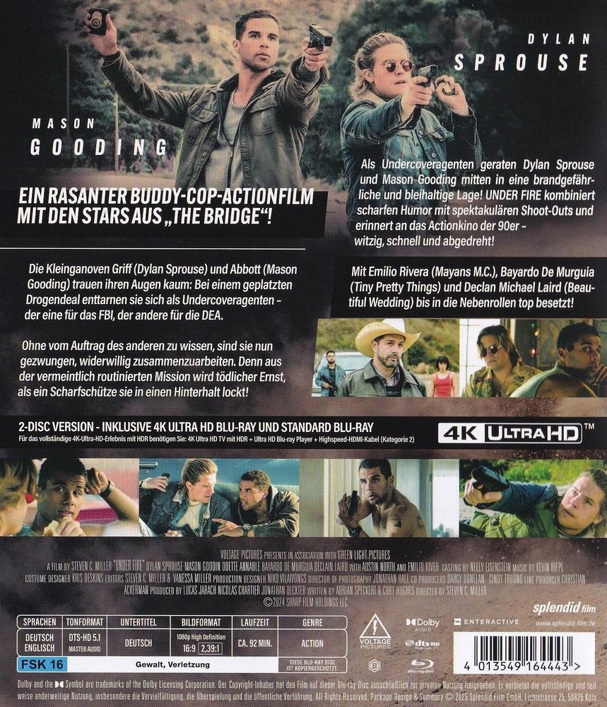 'Under Fire' (2025), ein rasanter Buddy-Cop-Actionfilm mit den Stars aus 'The Bridge'. Als Undercoveragenten geraten Dylan Sprouse und Mason Gooding mitten in eine brandgefährliche und bleihaltige Lage, in diesem Actionkrimi von Regisseur Steven C. Miller, der scharfen Humor mit spektakulären Shoot-Outs kombiniert und damit an das Actionkino der 90er Jahre erinnert. Witzig, schnell und abgedreht, mit Emilio Rivera ('Mayans M.C.'), Bayardo De Murguia ('Tiny Pretty Things') und Declan Michael Laird ('Beautiful Wedding') bis in die Nebenrollen top besetzt.