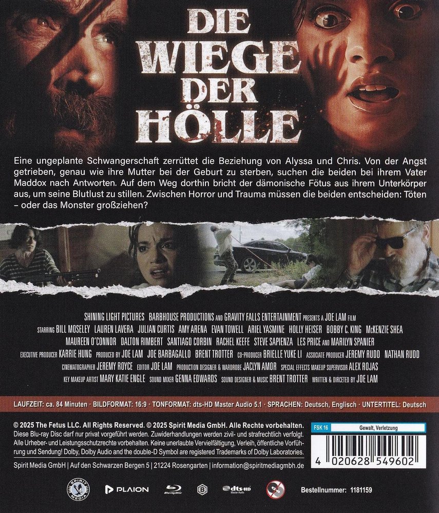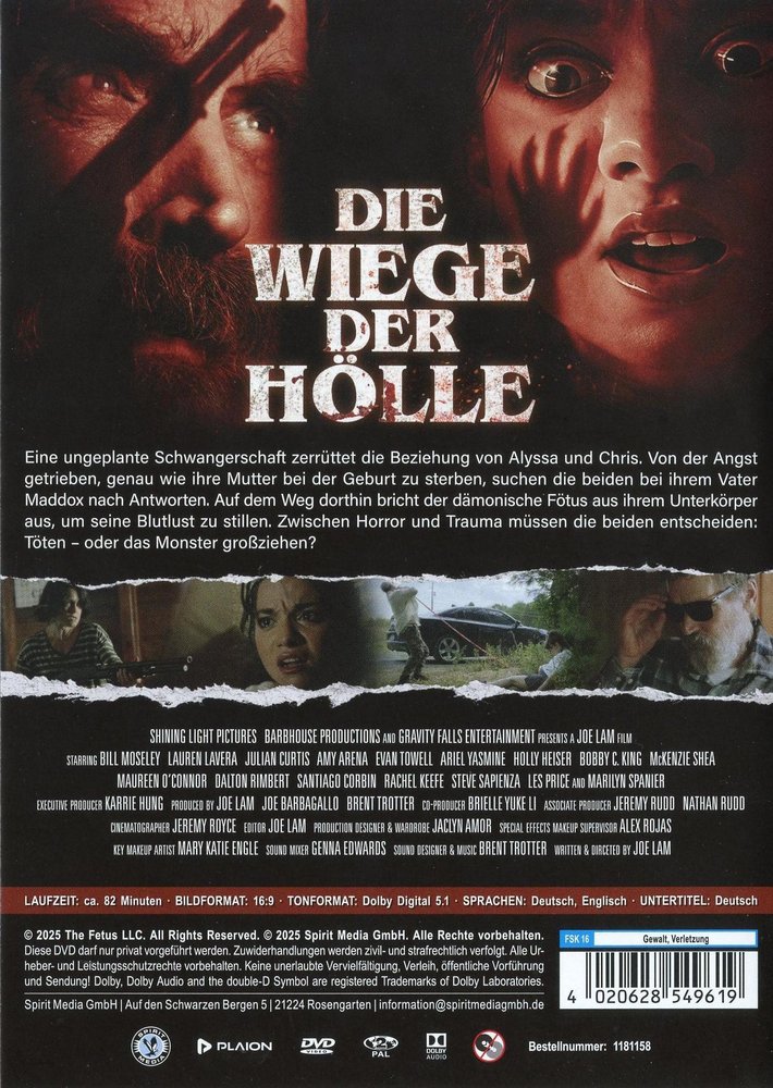 'Die Wiege der Hölle' alias 'The Fetus' (2025) ist ein blutgetränkter Horrorfilm, der klassische Praxiseffekte mit moderner Dämonenthematik verbindet. In dem Film, in dem sich das ungeborene Kind von Alessa und Chris als blutrünstiger Dämon entpuppt, steht das Paar vor der Entscheidung: Töten oder das Monster großziehen? Der Film beeindruckt mit Lauren LaVera (aus 'Terrifier' 2 und 3) neben Kult-Horrorstimme Bill Moseley ('Texas Chainsaw Massacre 2') in den Hauptrollen. Regisseur Joe Lam setzt auf aufwendige, handgemachte Spezialeffekte von einem preisgekrönten kolumbianischen VFX-Künstler, was diesem Film eine rohe, greifbare Intensität verleiht. 'The Fetus' ist grotesk und genau das Richtige für Fans von kompromisslosem Genre-Horror.