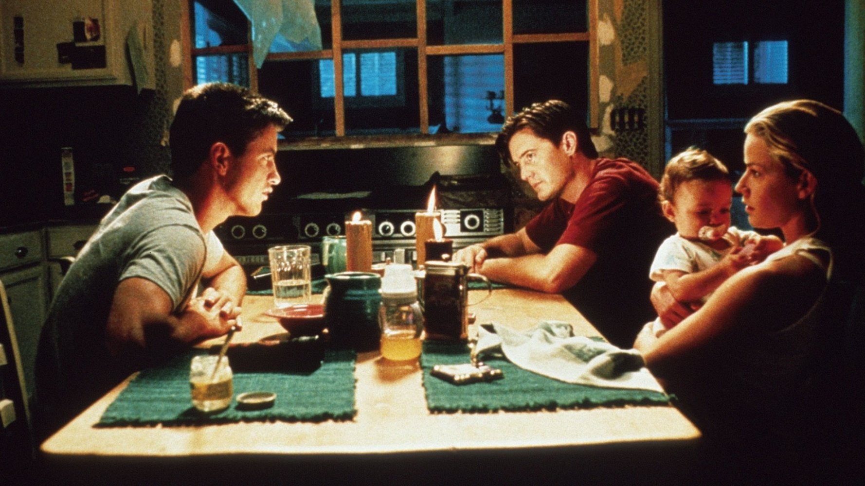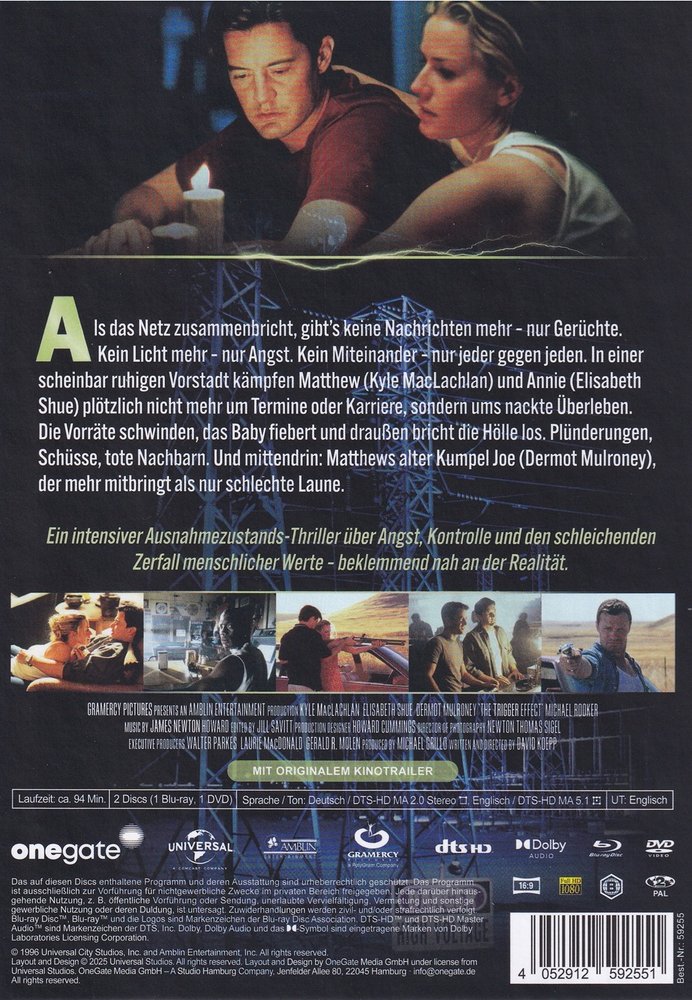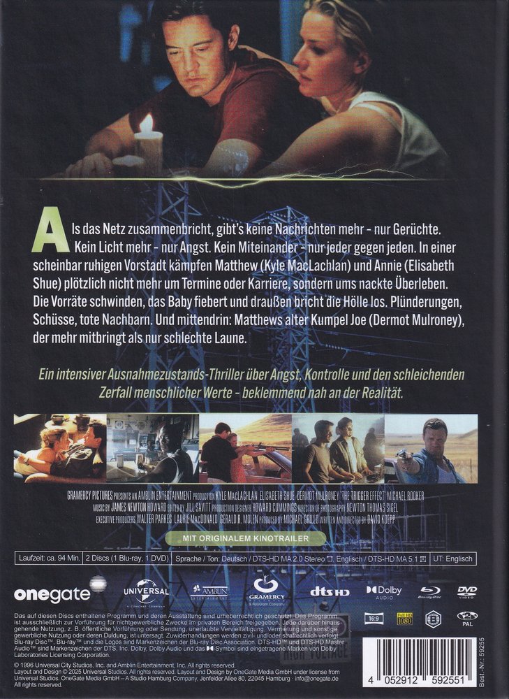 'The Trigger Effect - Der große Stromausfall' (1996), ein intensiver Ausnahmezustandsthriller von Regisseur David Koepp mit Kyle MacLachlan als Matthew, Elisabeth Shue als Annie, Dermot Mulroney als Joe, Richard T. Jones als Raymond, Bill Smitrovich als Steph, Michael Rooker als Gary, Mônica Torres und Molly Morgan als Babysitter über Angst, Kontrolle und den schleichenden Zerfall menschlicher Werte - beklemmend nah an der Realität.