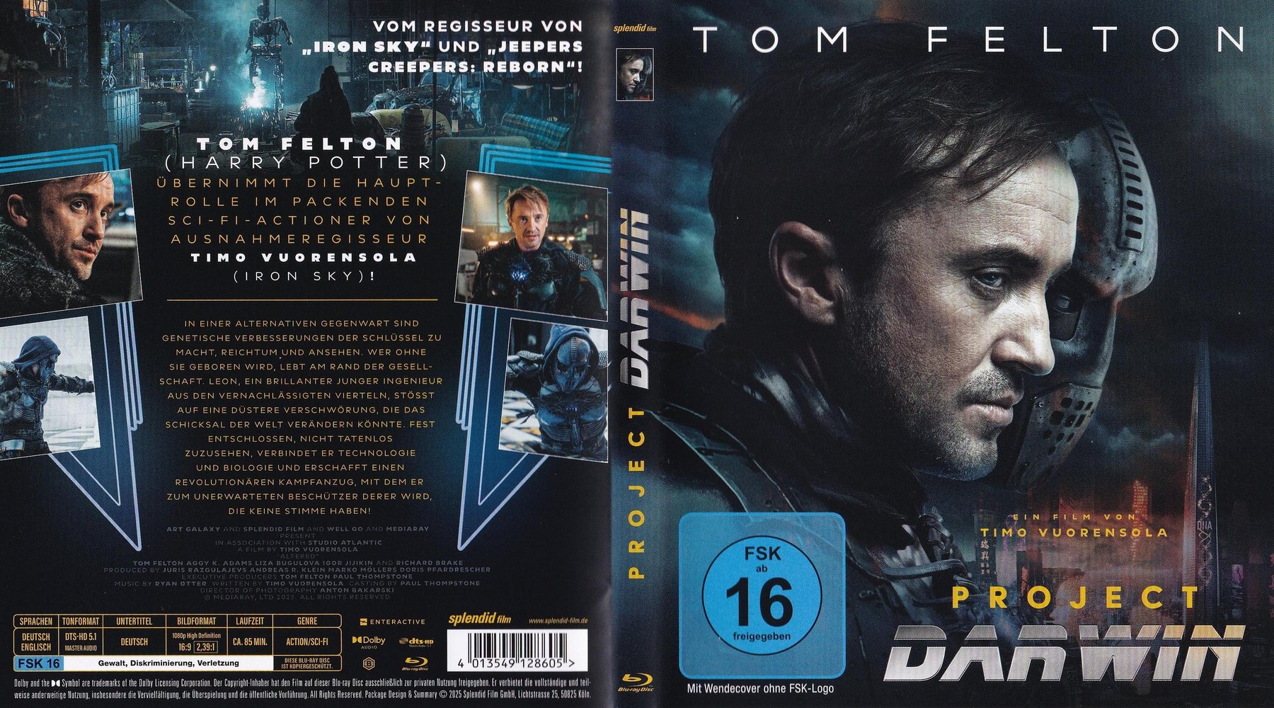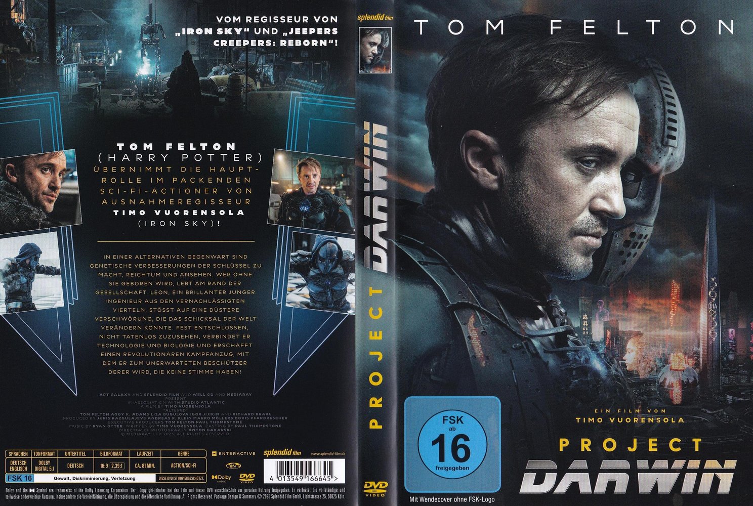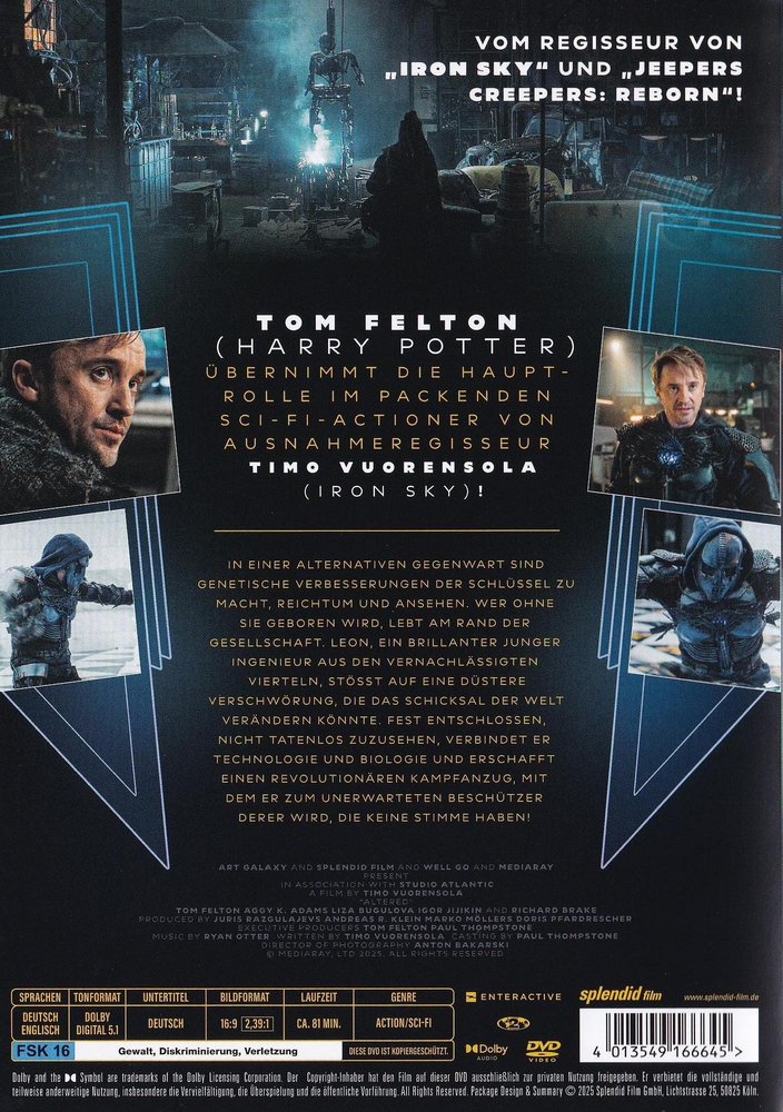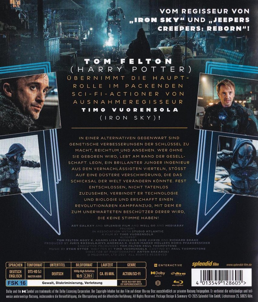 'Project Darwin' aka 'Altered' (2025), Tom Felton ('Harry Potter', 'Planet of the Apes - Prevolution') took on the lead role in this gripping sci-fi actioner from director Timo Vuorensola ('Iron Sky', 'Jeepers Creepers - Reborn'). Visually stunning, the film blends classic sci-fi and cyberpunk elements with natural motifs to create a stunning look. With fast-paced action, unpredictable twists and charismatic characters, a rousing story develops that consistently picks up speed. Supported by innovative CG technology, this world is brought to life with a force and depth of detail that will delight genre fans as well as a wide audience.