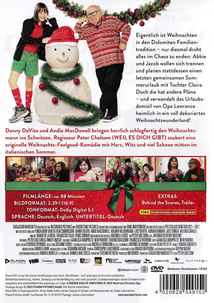 Danny DeVito as Grandpa Lawrance Armanetti and Andie MacDowell as Rose 'Gams' make Santa Claus sweat in 'A Sudden Case of Christmas' (2025), alongside Lucy DeVito as mother Abbie, Wilmer Valderrama as father Jacob and Antonella Rose as daughter Claire Randall. Director Peter Chelsom ('Because You Exist') conjures up an original Christmas feel-good comedy with heart, wit and lots of snow in the middle of the Italian summer.
