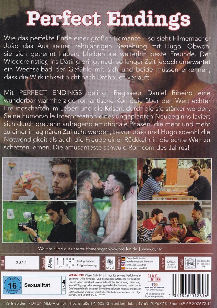Mit 'Perfect Endings' (2024) gelingt Regisseur Daniel Ribeiro eine wunderbar warmherzige romantische Liebesgeschichte über den Wert echter Freundschaften im Leben und die Krisen, durch die sie stärker werden. Seine humorvolle Interpretation eines ungeplanten Neubeginns laviert sich durch dreizehn aufregend emotionale Phasen, die mehr und mehr zu einer imaginären Zuflucht werden, bevor João und Hugo sowohl die Notwendigkeit als auch die Freude einer Rückkehr in die echte Welt zu schätzen lernen. Die amüsanteste schwule Romcom des Jahres.