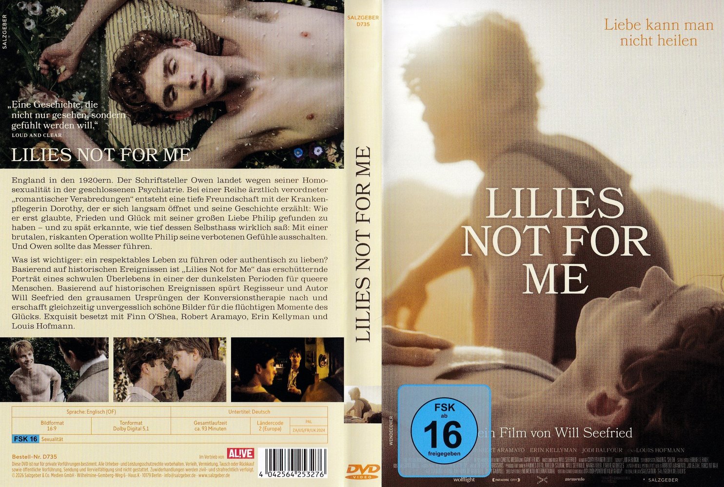 In 'Lilies Not for Me' (2024), dem Erstlingswerk von Regisseur Will Seefried mit Fionn O'Shea als Owen James, Robert Aramayo als Philip Fairfax, Louis Hofmann als Charles Green, Erin Kellyman als Dorothy Ellis, Jodi Balfour als Alice und Celeste Loots als Krankenschwester. Was ist wichtiger: ein respektables Leben zu führen oder authentisch zu lieben? Basierend auf historischen Ereignissen ist 'Lilies Not For Me' das erschütternde Porträt eines schwulen Überlebens in einer der dunkelsten Perioden für queere Menschen. Das Langfilmdebüt von Regisseur und Autor Seefried inszeniert die Ursprünge der Konversionstherapie in unvergesslichen Bildern, die den Schrecken dieser 'Behandlungen' und ihrer Folgen sicht- und fühlbar machen. Ein exzellentes Schauspieler-Ensemble aus O'Shea ('Handsome Devil'), Aramayo ('Der Herr der Ringe - Die Ringe der Macht'), Hofmann ('Dark') und Kellyman ('Solo - A Star Wars Story') sorgt dafür, dass auch in Momenten größter Grausamkeit das Menschliche nie verloren geht.