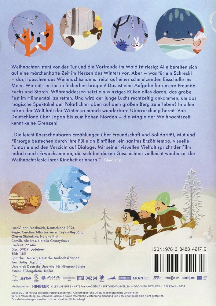 Weihnachten steht vor der Tür und die Vorfreude im Wald ist riesig. Alle bereiten sich auf eine märchenhafte Zeit im Herzen des Winters vor. Aber - was für ein Schreck! Das Häuschen des Weihnachtsmanns treibt auf einer schmelzenden Eisscholle ins Meer. Wir müssen ihn in Sicherheit bringen. Das ist eine Aufgabe für unsere Freunde Fuchs und Storch. Währenddessen setzt ein winziges Küken alles daran, das große Fest im Hühnerstall zu retten. Und wird der junge Luchs rechtzeitig ankommen, um das magische Spektakel der Polarlichter oben auf dem großen Berg zu erleben? In allen Ecken der Welt hält der Winter so manch wunderbare Überraschung bereit. Von Deutschland über Japan bis zum hohen Norden, die Magie der Weihnachtszeit kennt keine Grenzen.