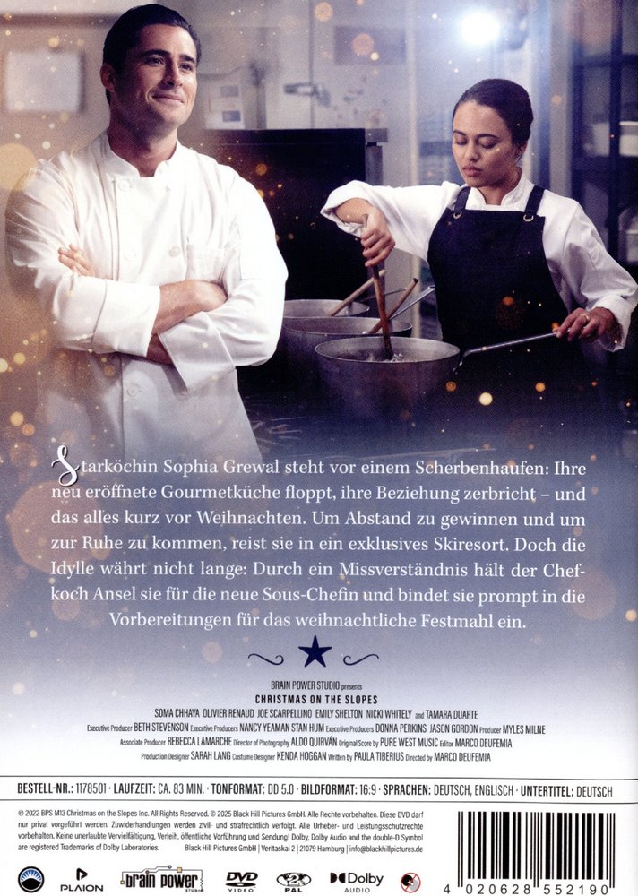 'Weihnachten im Chalet' alias 'Christmas on the Slopes' (2022), eine festliche Liebesgeschichte mit kulinarischem Charme. Nach einer misslungenen Restaurant-Eröffnung und einer plötzlichen Trennung gönnt sich die prominente Köchin Sophia Grewal ihren ersten echten Weihnachtsurlaub. In einem luxuriösen Skiresort wird sie versehentlich für die neue Sous-Chefin gehalten und muss sich mit dem grummeligen Chefkoch Ansel Wallee arrangieren. Zwischen kulinarischen Missverständnissen und aufkeimender Romantik entdecken sie unter der Regie von Marco Deufemia gemeinsam die wahre Bedeutung von Weihnachten. Deufemia bringt als erfahrener Regisseur festlicher TV-Filme bewährtes Gespür für herzerwärmende Stimmung und stimmungsvolle Bilderwelten mit. Hauptdarstellerin Soma Chhaya und Genre-Experte Olivier Renaud ('Christmas on 5th Avenue') überzeugen mit authentischer Chemie und emotionaler Tiefe. Dieser Film kombiniert klassische Weihnachtsromantik mit dem besonderen Reiz eines verschneiten Ski-Resorts.