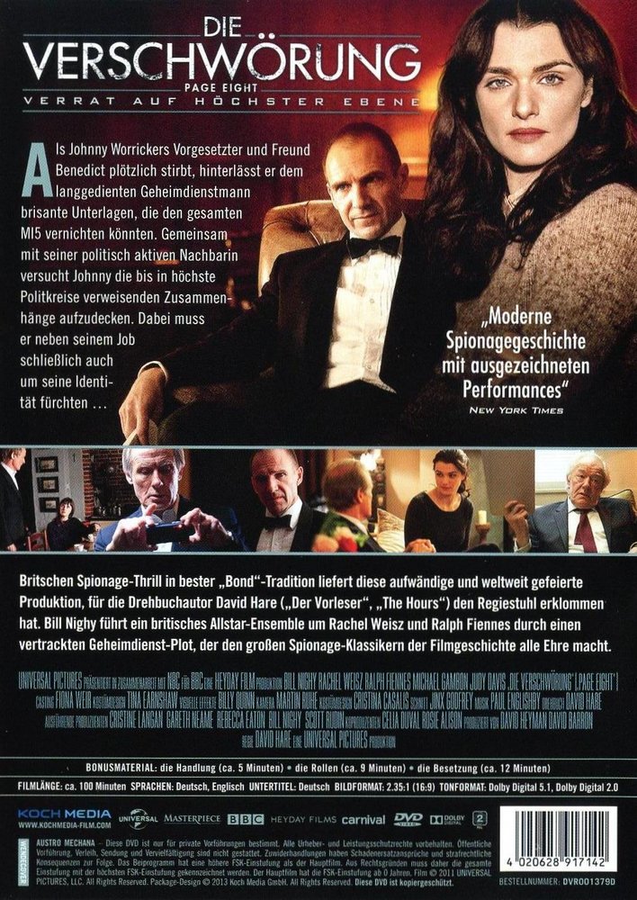 'The Conspiracy - Betrayal at the Highest Level' aka 'The Worricker Trilogy - Page Eight' (2011) is a British spy thriller in the best John le Carré tradition ('Lady, King, Ace, Spy'), the elaborate production for which screenwriter David Hare ('The Reader') has once again climbed into the director's chair. Bill Nighy ('Harry Potter 7') leads a British all-star ensemble around Rachel Weisz, Michael Gambon and Ralph Fiennes through a tricky secret service plot that lives up to the great spy classics of film history.