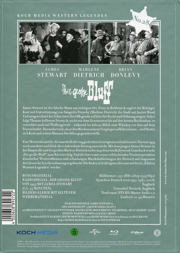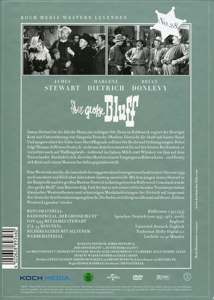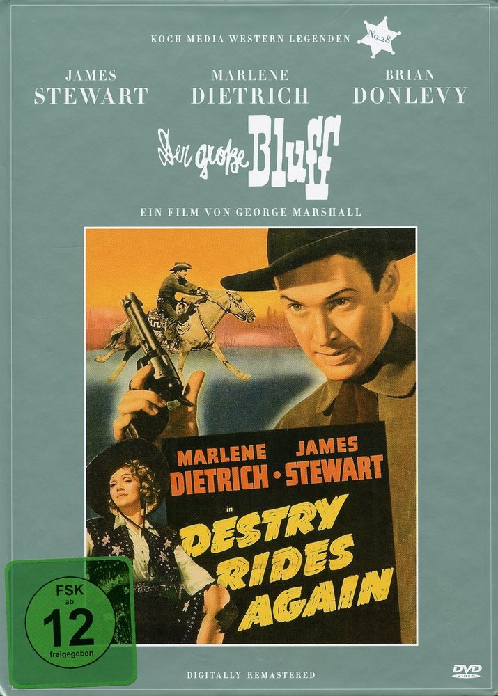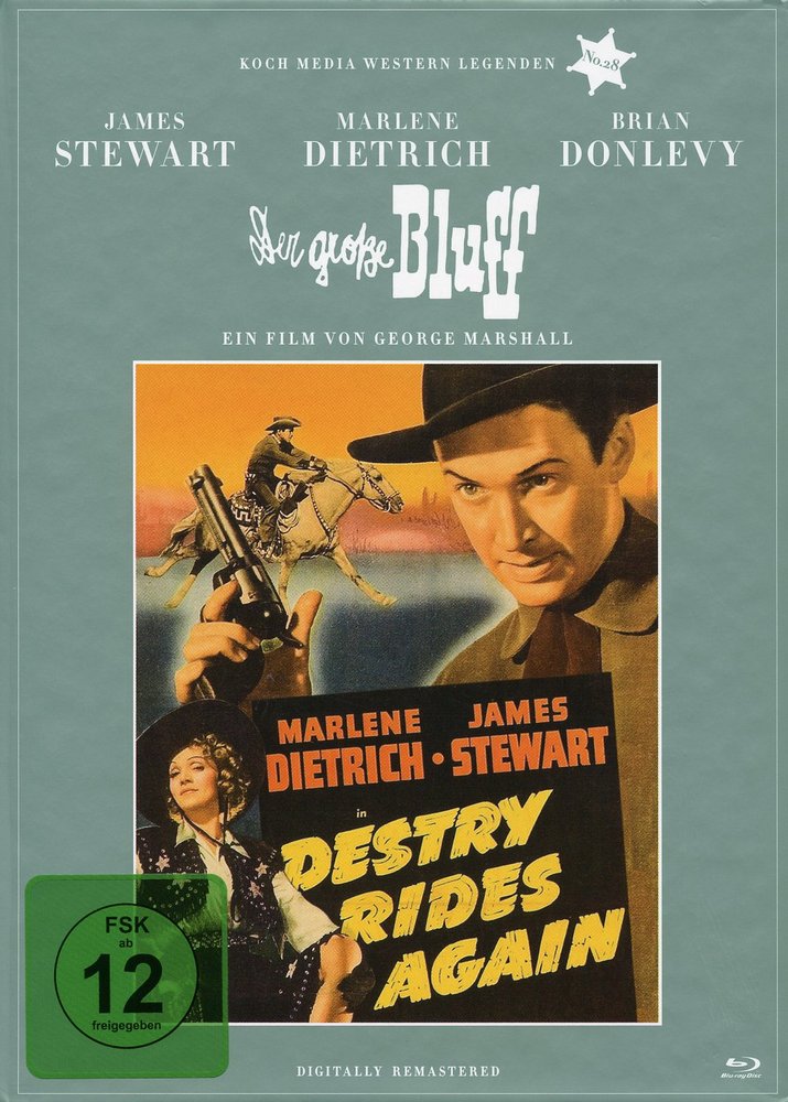 George Marshalls 'Destry Rides Again - Der große Bluff' (1939), eine Westernkomödie, die innerhalb der eng gesteckten Genregrenzen funktioniert. Das war Ende der dreißiger Jahre noch unerhört und blieb über Jahrzehnte unerreicht. Mit dem jungen James Stewart in der Hauptrolle als Tom Destry Jr. und der großen Marlene Dietrich als Frenchy in ihrem gefeierten Hollywood-Comeback neben Mischa Auer als Boris, Charles Winninger als Washington Dimsdale, Brian Donlevy als Kent, Irene Hervey als Janice Tyndall, Una Merkel als Lily Belle, Allen Jenkins als Gyp Watson, Warren Hymer als Bugs Watson sowie Billy Gilbert als Loupgerou wurde 'Der große Bluff' zum Riesenerfolg. Und der hat es mit seiner erfrischenden Neuinterpretation klassischer Westernthemen und schmissigen Musikdarbietungen der Dietrich auf insgesamt drei deutsche Synchronfassungen gebracht. Die finden sich übrigens allesamt auf dieser Heimkinoausgabe wieder.