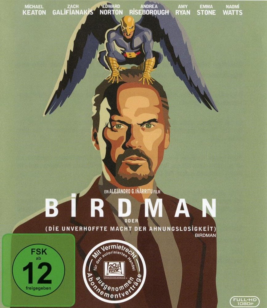 'Birdman oder Die unverhoffte Macht der Ahnungslosigkeit', der 2015 mit 2 'Golden Globes' ausgezeichnet und für 9 'Oscars' nominiert und mit 4 'Oscars' prämiert wurde (darunter als 'Bester Film 2015'), glänzt mit einem herausragenden Star-Ensemble. In den Hauptrollen zu sehen sind der brillante Michael Keaton, Zach Galifianakis, Edward Norton, Andrea Riseborough, Amy Ryan, Emma Stone, Naomi Watts, Lindsay Duncan, Merritt Wever, Jeremy Shamos, Bill Camp und Damian Young. Regie führte Alejandro G. Iñárritu (siehe 'Amores Perros' 2000, '21 Gramm' 2003, 'Babel' 2006, 'Biutiful' 2010). Das Drehbuch stammt von Iñárritu, Nicolás Giacobone, Alexander Dinelaris, Jr. und Armando Bo. Für die Produktion zeichnen verantwortlich Iñárritu, John Lesher ('End of Watch'), Arnon Milchan ('12 Years A Slave') und James W. Skotchdopole ('Django Unchained'). Ausführende Produzenten sind Christopher Woodrow ('Killer Joe'), Molly Conners ('Frozen River') und Sarah E. Johnson ('Wish I Was Here'). Des weiteren gehören zum Filmteam Kameramann Emmanuel Lubezki, ASC/AMC ('Gravity'), Produktionsdesigner Kevin Thompson ('Michael Clayton'), der Schnitt stammt von Douglas Crise ('Babel') und Stephen Mirrione, A.C.E. ('Im August in Osage County'), das Casting von Francine Maisler, CSA ('12 Years A Slave'), Kostüme von Albert Wolsky ('Zeiten des Aufruhrs') und der Drum-Score von Antonio Sanchez.