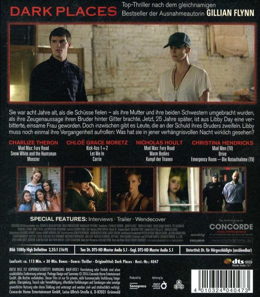 Mit 'Dark Places - Gefährliche Erinnerung' (2015) hat Gilles Paquet-Brenner (siehe u.a. auch 'Walled In - Eingemauert' 2008 und 'Sarahs Schlüssel' 2010) einen düsteren, spannenden Thriller geschaffen, bei dem Oscar-Preisträgerin Charlize Theron ('Monster', 'Mad Max 4 - Fury Road') nicht nur vor der Kamera als Hauptdarstellerin, sondern auch als Produzentin fungierte.