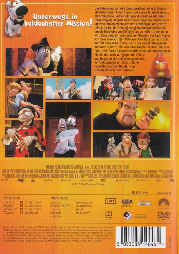 The lovable Tad Stones earns his living as a construction worker, but has dreamed of exploring the world as an archaeologist and treasure hunter since childhood. The excitement is great when one day the renowned archaeologist and his secret crush Sara Lavroff asks him to help her solve the mysterious mystery of King Midas' necklace. But then, during the mission, Sara is suddenly kidnapped in front of Tad's eyes by the shady millionaire Jack Rackham, who wants to get hold of the mysterious chain with her help. Tad, his dog Jeff, Sara's assistant Tiffany and the clumsy mummy join forces in a race against time and embark on a thrilling chase to free Sara and the necklace from the hands of villain Rackham.