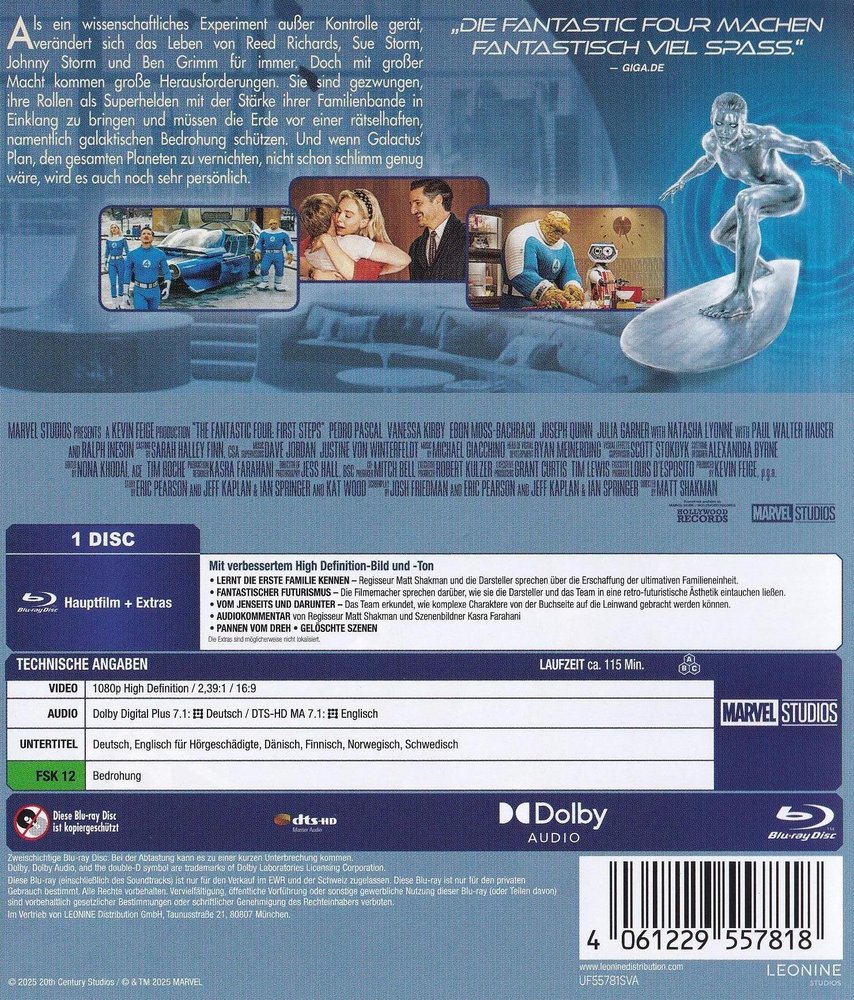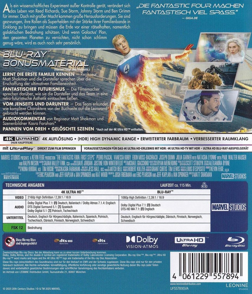 Willkommen in der Familie. Eine der berühmtesten Familien des 'MCU', des 'Marvel Cinematic Universe', kam im Filmjahr 2025 mit dem deutschen Kinostart am 24. Juli 2025 zurück auf die große Leinwand: 'The Fantastic Four', hierzulande bekannt als 'Die Fantastischen Vier'. Das Superhelden-Quartett bestehend aus Mr. Fantastisch, Das Ding ('The Thing'), Die Unsichtbare ('Invisible Woman') und der menschlichen Fackel ('Human Torch'). Starbesetzt mit Pedro Pascal als Reed Richards aka 'Mister Fantastic', Vanessa Kirby als Sue Storm aka 'Invisible Woman' und Ebon Moss-Bachrach als Ben Grimm, das Ding. In dem Actionabenteuer spielen außerdem Paul Walter Hauser, John Malkovich, Natasha Lyonne und Sarah Niles mit. Regie führte Matt Shakman ('WandaVision'), Produzent war Kevin Feige und Executive-Producers sind Louis D'Esposito, Grant Curtis und Tim Lewis. 'The Fantastic Four - First Steps' kommen in Deutschland auf DVD, Blu-ray und 4K-UHD ab 31. Oktober 2025 auch in dein Heimkino!