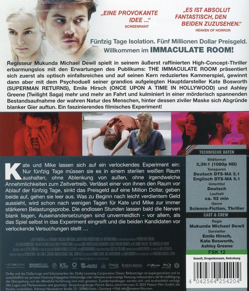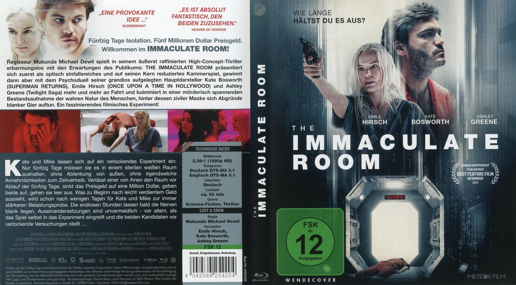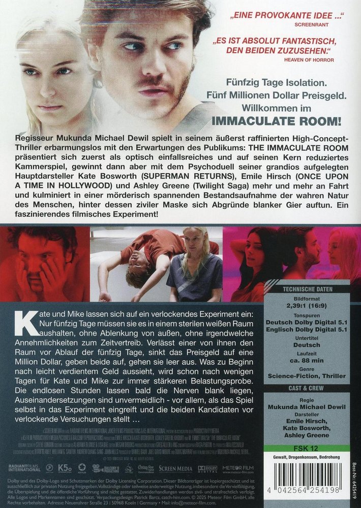 Fünfzig Tage Isolation. Fünf Millionen Dollar Preisgeld. Willkommen im 'Immaculate Room': Kate (Kate Bosworth) und Mike (Emile Hirsch), ein scheinbar perfektes Paar, nehmen an einem psychologischen Experiment teil, bei dem es um 5 Millionen Dollar geht, wenn sie 50 Tage in einem eleganten, weißen Raum in völliger Isolation überleben können. Keine Telefone, keine Familie - nur die Stimme des 'Immaculate Room' hält sie in Schach. Doch während die Uhr abläuft, wird der Raum mehr, als er auf den ersten Blick schien, und stellt sie vor grausame Tests, um ihre Entschlossenheit zu brechen, er bringt schließlich sogar private Dämonen zum Vorschein, die sie möglicherweise nicht überleben...