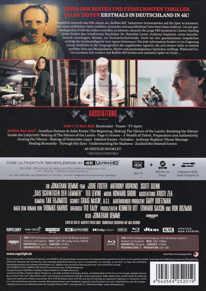 Aspiring FBI agent Clarice Starling (Jodie Foster) gets a special assignment: With the help of the brilliant psychiatrist Hannibal Lecter (Anthony Hopkins), she is supposed to try to catch a serial killer. Time is of the essence, because 'Buffalo Bill' already has a new victim in his power. What makes Team Starling/Lecter special: Lecter is himself a convicted murderer with cannibalistic tendencies...