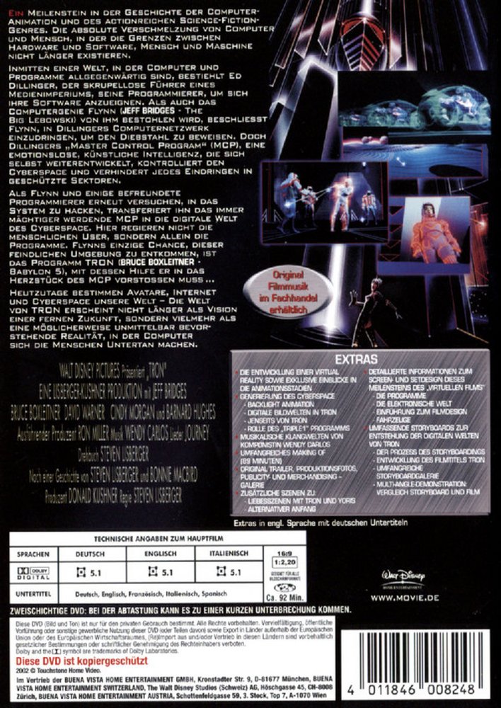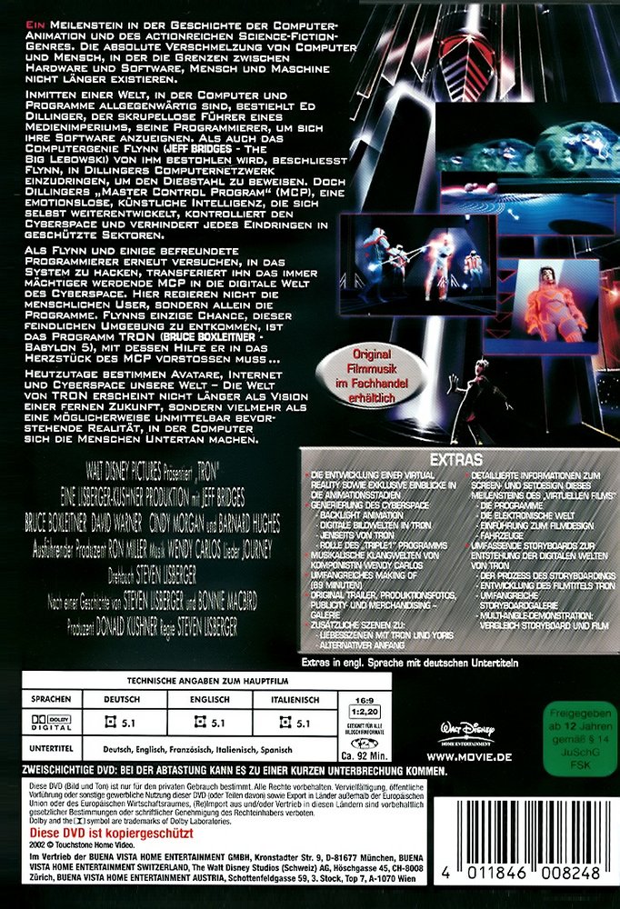 Ein Meilenstein in der Geschichte der Computer-Animation und des actionreichen Science-Fiction-Genres. Die absolute Verschmelzung von Computer und Mensch, in der die Grenzen zwischen Hardware und Software, Mensch und Maschine nicht länger existieren: Inmitten einer Welt, in der Computer und Programme allgegenwärtig sind, bestiehlt Ed Dillinger, der skrupellose Führer eines Medienimperiums seine Programmierer um sich ihre Software anzueignen. Als auch das Computer-Genie Flynn (Jeff Bridges) von ihm bestohlen wird, beschliesst er in Dillingers Computernetzwerk einzudringen, um den Diebstahl zu beweisen. Doch Dillingers 'Master Control Program' (MCP), eine emotionslose, künstliche Intelligenz die sich selbst weiter entwickelt, kontrolliert den Cyberspace und verhindert jedes Eindringen in geschützte Sektoren. Als Flynn und einige befreundete Programmierer erneut versuchen in das System zu hacken, transferiert ihn das immer mächtiger werdende MCP in die digitale Welt des Cyberspace. Hier regieren nicht die menschlichen User, sondern allein die Programme. Flynns einzige Chance dieser feindlichen Umgebung zu entkommen, ist das Programm TRON (Bruce Boxleitner), mit dessen Hilfe er in das Herzstück des MCP vorstossen muss. Heutzutage bestimmen Avatare, Internet und Cyberspace unsere Welt - Die Welt von TRON erscheint nicht länger als Vision einer fernen Zukunft, sondern vielmehr als eine möglicherweise unmittelbar bevorstehende Realität, in der Computer sich die Menschen zu Untertan machen.