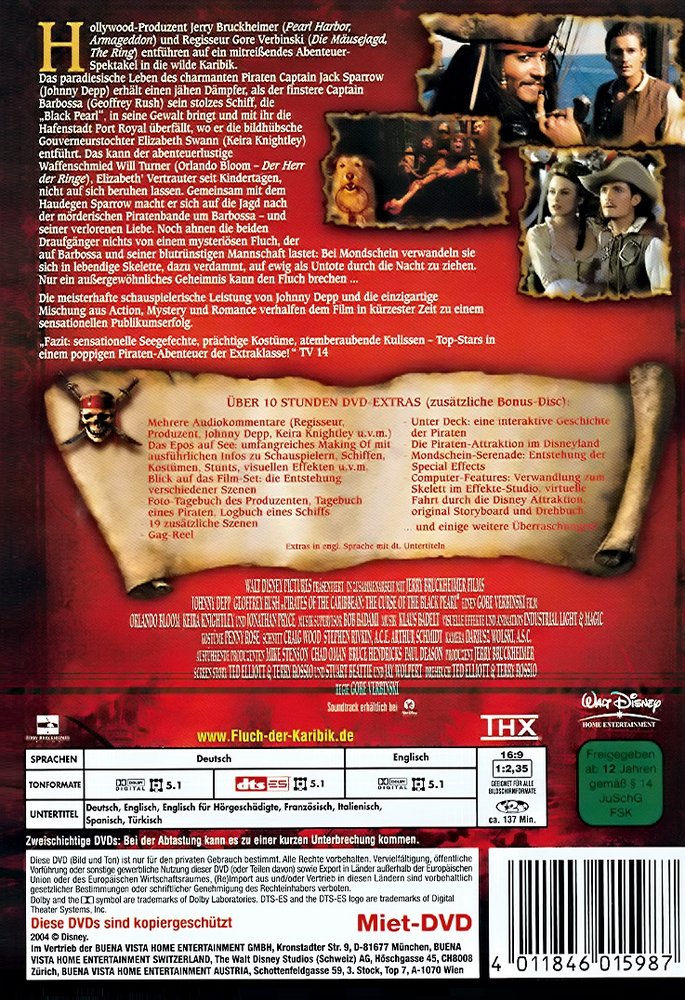 Hollywood-Produzent Jerry Bruckheimer ('Pearl Harbor', 'Armageddon') und Regisseur Gore Verbinski ('Mäusejagd', 'The Ring') entführen Filmfans mit ihrem 'Pirates of the Caribbean - Fluch der Karibik' (2003) auf ein mitreißendes Abenteuer-Spektakel in die wilde Karibik. Die meisterhafte schauspielerische Leistung von Johnny Depp und die einzigartige Mischung aus Action, Mystery und Romance verhalfen dem Film in kürzester Zeit zu einem sensationellen Publikumserfolg.