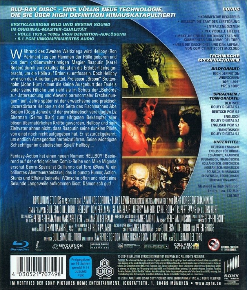 Extras:Interaktive Menüs, Kapitelanwahl, DVD Intro von Ron Perlman, Videokommentar Besetzung, Produktions-Workshop (Make-up & Belichtungstests, VFX Visuelle Effekte), Comic-Con 2002 mit Guillermo del Toro, Ron Perlman und Mike Mignola (23 Minuten), Über die Geschichte und den Aufbau von Comics mit Scott McCloud, Galerie mit mehreren hundert Abbildungen (Standbilder, Mike Mignola - Zeichnungen, Notizbuch Regisseur - Auszüge, Hellboy-Galerie mit Zeichnungen verschiedener Comic-Künstler).
