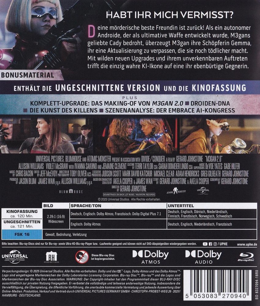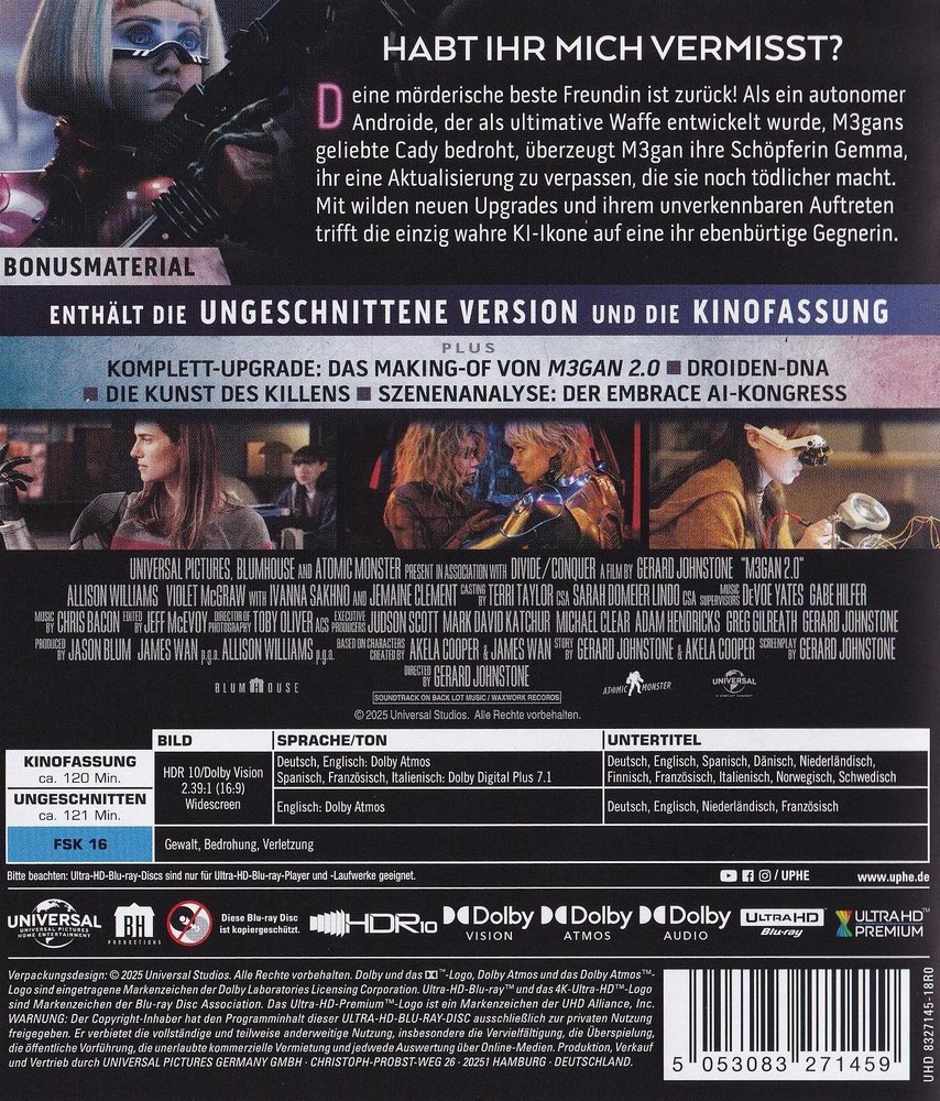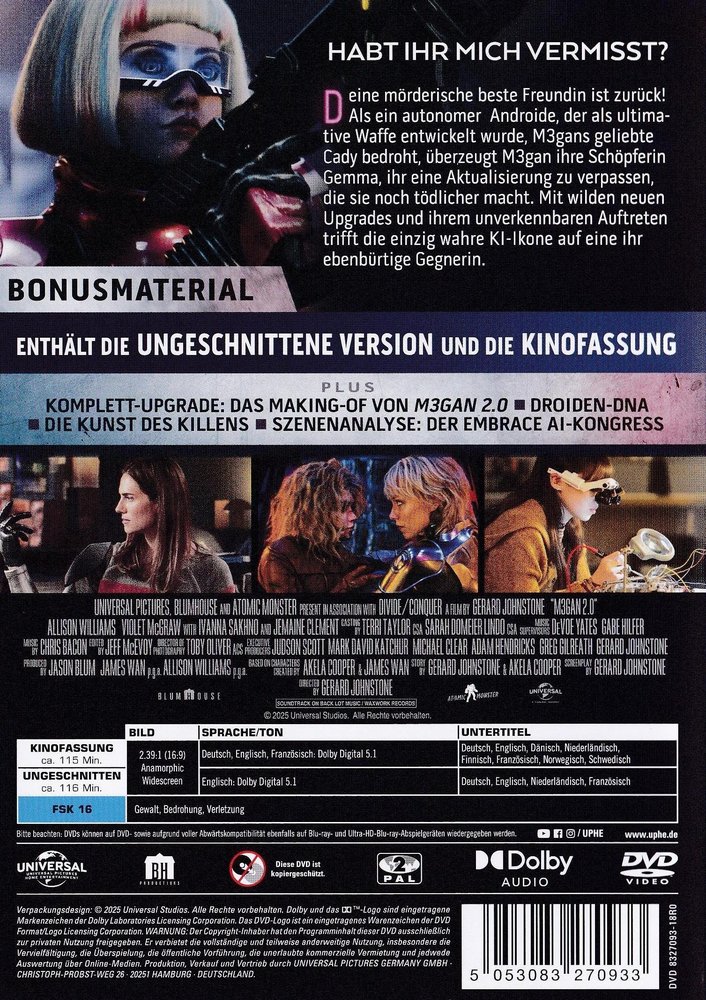 This Bitch is back. Here comes the sequel to the Blumhouse sci-fi thriller hit 'M3GAN' from the 2022 film year. 'M3GAN 2.0' (2025) was once again directed by Gerard Johnstone, also on board are Allison Williams as Gemma, Violet McGraw as Cady, Amie Donald as M3GAN, Jenna Davis as M3GAN's voice, Jemaine Clement, Ivanna Sakhno as Amelia, Brian Jordan Alvarez as Cole, Mike Edward as Todd and Aristotle Athari, at the theatrical release in Germany on June 26, 2025. Then the murderous doll that conquered the heart of pop culture at the time will be back. But this time she is not alone! The original creative team behind the 'M3GAN' phenomenon, led by horror giants James Wan of 'Atomic Monster', Jason Blum of 'Blumhouse' and director Gerard Johnstone, launches a brand new wild chapter of AI chaos with 'M3GAN 2.0'. The first M3GAN smashed box office records when it achieved the most successful US opening weekend of a PG-13 horror film since 'A Quiet Place 2' with a gross of 30.4 million dollars. Worldwide, the film finally grossed a total of more than 180 million dollars, so it's no wonder that the sequel is now being released here.