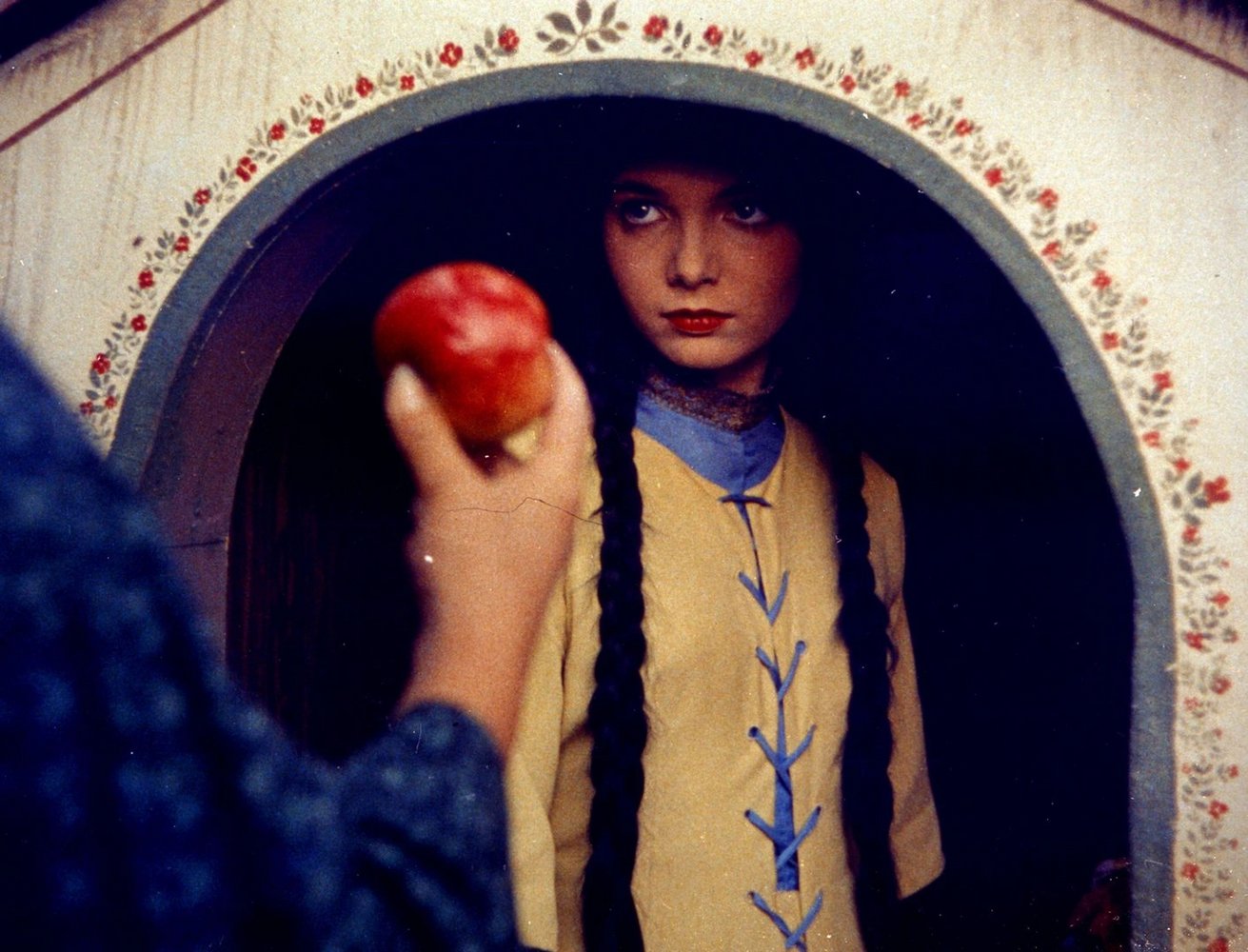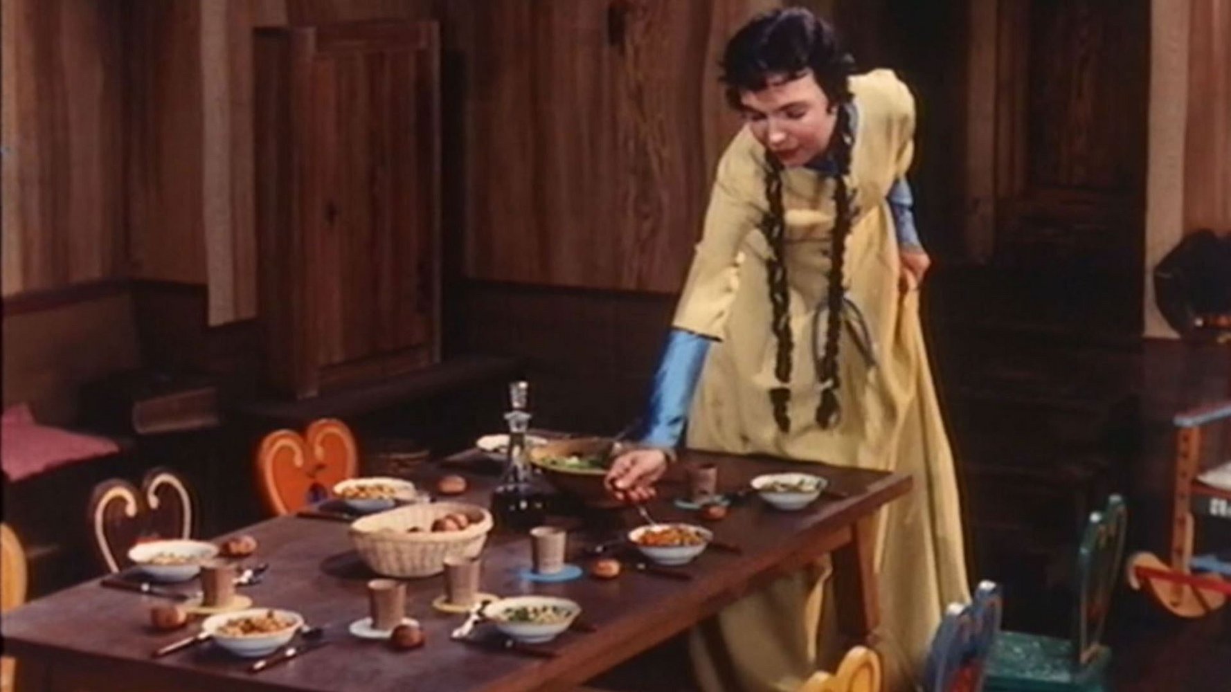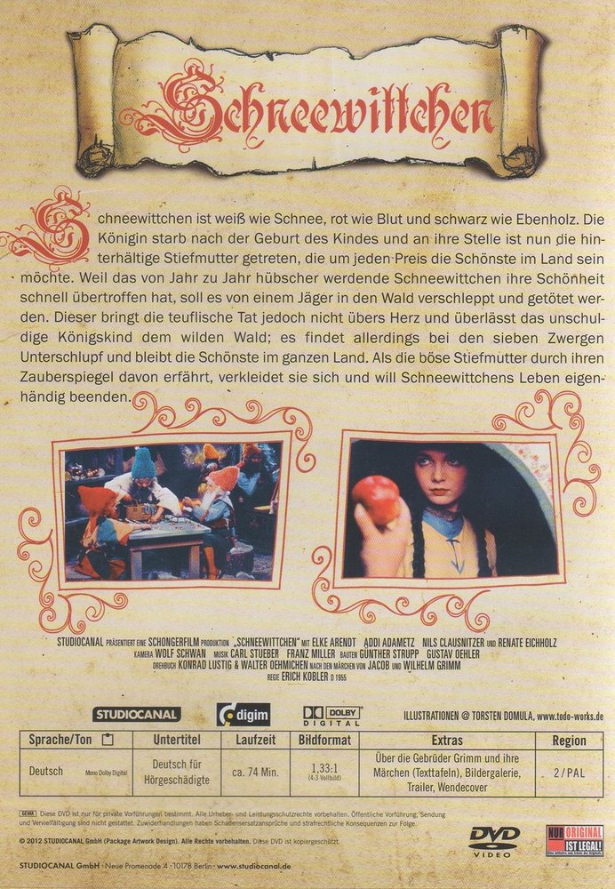 The king's daughter Snow White (Elke Arendt) is of enchanting beauty. Her skin is white as snow, her lips red as blood, and her hair black as ebony. After the queen had died giving birth to her daughter, the king had remarried. But Snow White's stepmother is a vain and selfish woman who wants to be the most beautiful in the land at all costs. So she orders the hunter to kill Snow White. But he does not have the heart to do the deed and leaves the innocent king's child to the wild forest. There the beautiful girl finds shelter with the seven dwarfs, who protect her and love her above all else. But when the evil stepmother learns about it through her magic mirror, she disguises herself to kill Snow White herself.