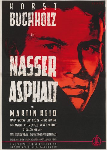 With the embodiment of the young journalist Greg Bachmann, Horst Buchholz finally established himself as the German answer to James Dean, whose famous Broadway rain photo he imitated on contemporary posters. The star-studded film 'Nasser Asphalt' (1958) by Frank Wisbar was awarded the FWB title 'Valuable'. Hans-Martin Majewski received the 'Filmband in Silver' for the music.