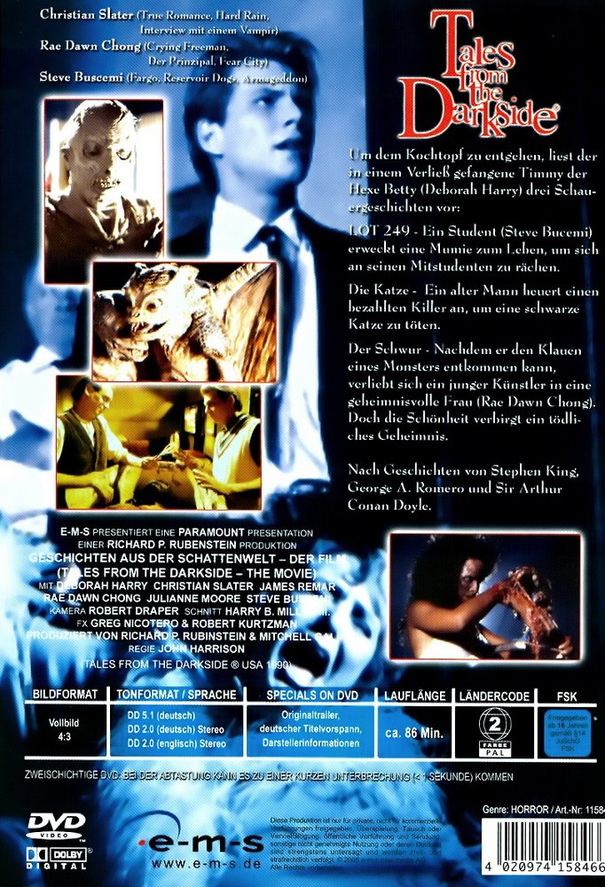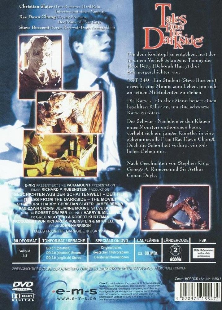 'Geschichten aus der Schattenwelt - Der Film' alias 'Tales from the Darkside - The Movie' (1990) vereint drei Film von den Meistern des Horrors Stephen King und George A. Romero, starbesetzt mit Christian Slater ('Interview mit einem Vampir'), Rae Dawn Chong ('Fear City') und James Remar ('Das Phantom').