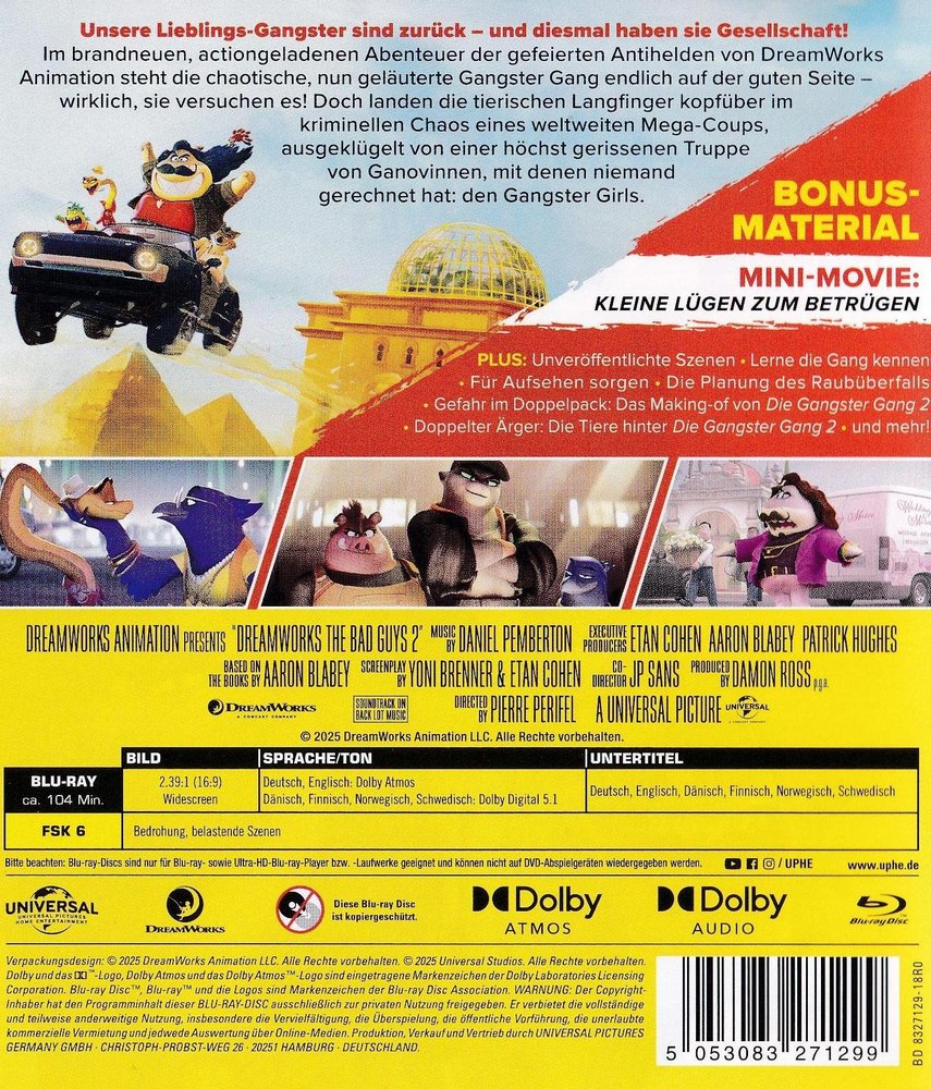 Es ist immer noch gut, böse zu sein! Im Kino-Sommer 2025 kehrt die Gangster Gang auf die große Leinwand zurück! 'Die Gangster Gang 2' (2025) folgt dem DreamWorks-Animationserfolg 'Die Gangster Gang' alias 'The Bad Guys' (2022), der auf der erfolgreichen Kinderbuchreihe von Aaron Blabey basiert. Im Regiestuhl saß erneut Pierre Perifel. Der Kinostart in Deutschland findet am 28. August 2025 statt. Basierend auf der gefeierten Buch-Bestsellerreihe von Aaron Blabey, deren Verkäufe nach dem Erfolg des ersten Films von 8 auf über 30 Millionen Exemplare gestiegen sind, bringt 'Die Gangster Gang 2' die beliebte Bande wieder zusammen. Der gefeierte Regisseur Perifel und Produzent Damon Ross verhelfen uns zu einem Wiedersehen mit dem charismatischen Mr. Wolf (deutsch gesprochen von Sebastian Bezzel), dem zynischen Safeknacker Mr. Snake, dem Meister der Maskerade Mr. Shark, dem temperamentvollen Mr. Piranha (Jannis Niewöhner) und der Experten-Hackerin Ms. Tarantula alias 'Webs'. In 'Die Gangster Gang 2' bekommen sie es mit den raffinierten Künsten der 'Bad Girls' zu tun. Angeführt von Kitty Kat, einer gefährlich cleveren Schneeleopardin, gehören zur Truppe die brillante bulgarische Wildschwein-Ingenieurin Pigtail und die listige Rabendame Doom, die ein außergewöhnliches Talent für Täuschungen besitzt. Natürlich sind auch die schlagfertige Gouverneurin Diane Foxington, der geniale Professor Marmelade, die mittlerweile beförderte Polizeichefin Misty Luggins und die sensationshungrige Reporterin Tiffany Fluffit bei diesem Auftrag wieder mit von der Partie. Als Co-Regisseur des rasanten Animationsabenteuers agiert JP Sans, der bereits beim ersten Teil als Leiter der Charakteranimation ein Komplize war. In der englischen Originalfassung sind die Stimme von Sam Rockwell, Awkwafina, Marc Maron, Craig Robinson, Anthony Ramos, Danielle Brooks, Natasha Lyonne, Maria Bakalova, Zazie Beetz, Richard Ayoade, Lilly Singh und Alex Borstein zu hören. Für die Filmmusik kehrt der Oscar-nominierte Komponist Daniel Pemberton an den Tatort zurück.