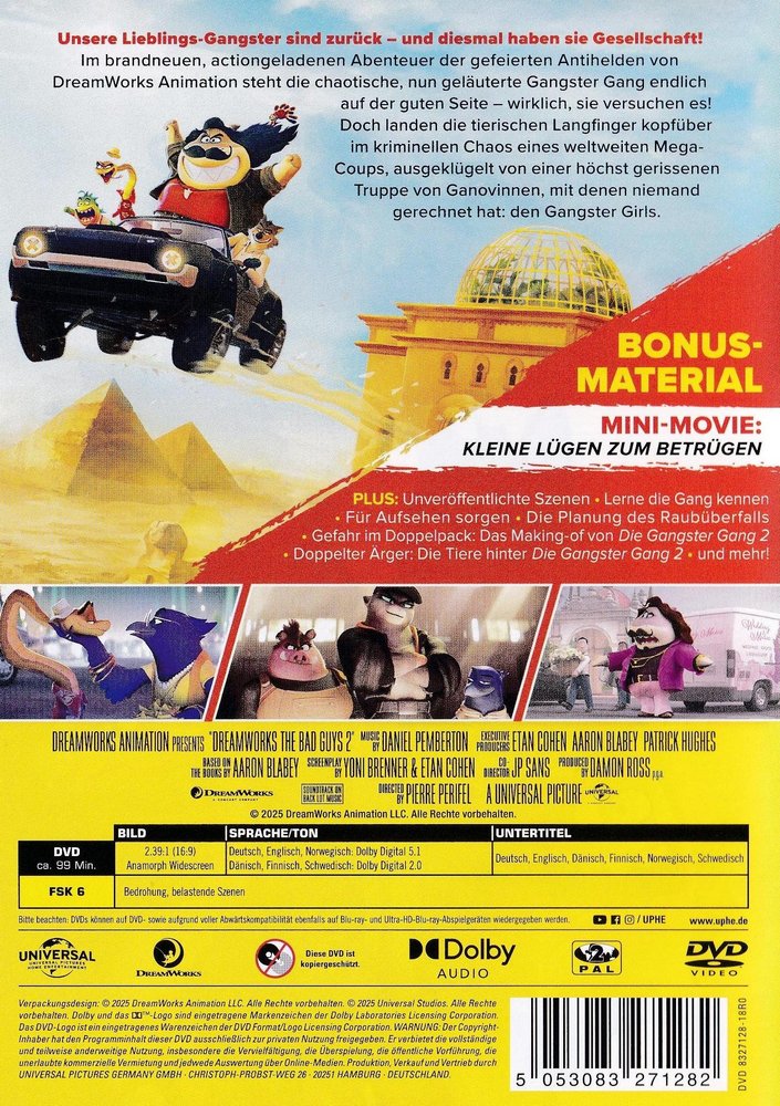 Our favorite gangsters are back - and this time they have company! In the action-packed second cinematic adventure of the acclaimed antiheroes of 'DreamWorks Animation', the chaotic, now reformed gangster gang is finally on the good side - really, they're trying! But the animal thieves end up headlong in the criminal chaos of a worldwide mega-coup, devised by a highly cunning troop of crooks that no one expected: the Gangster Girls. In 'The Gangster Gang 2' they have to deal with the sophisticated arts of the Gangster Girls. Led by Kitty Kat, a dangerously clever snow leopard, the troupe includes the brilliant Bulgarian wild boar engineer Pigtail and the cunning raven lady Doom, who has an extraordinary talent for deception. Of course, the quick-witted Governor Diane Foxington, the brilliant Professor Marmelade (with the German voice of Max Giermann), the now promoted police chief Misty Luggins and the sensation-hungry reporter Tiffany Fluffit are also part of this assignment again...