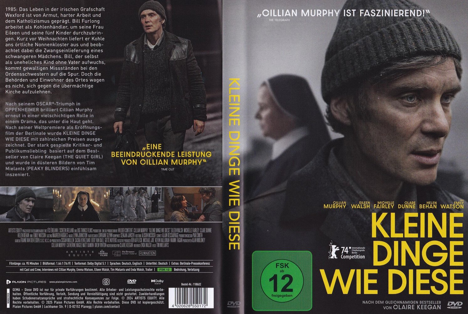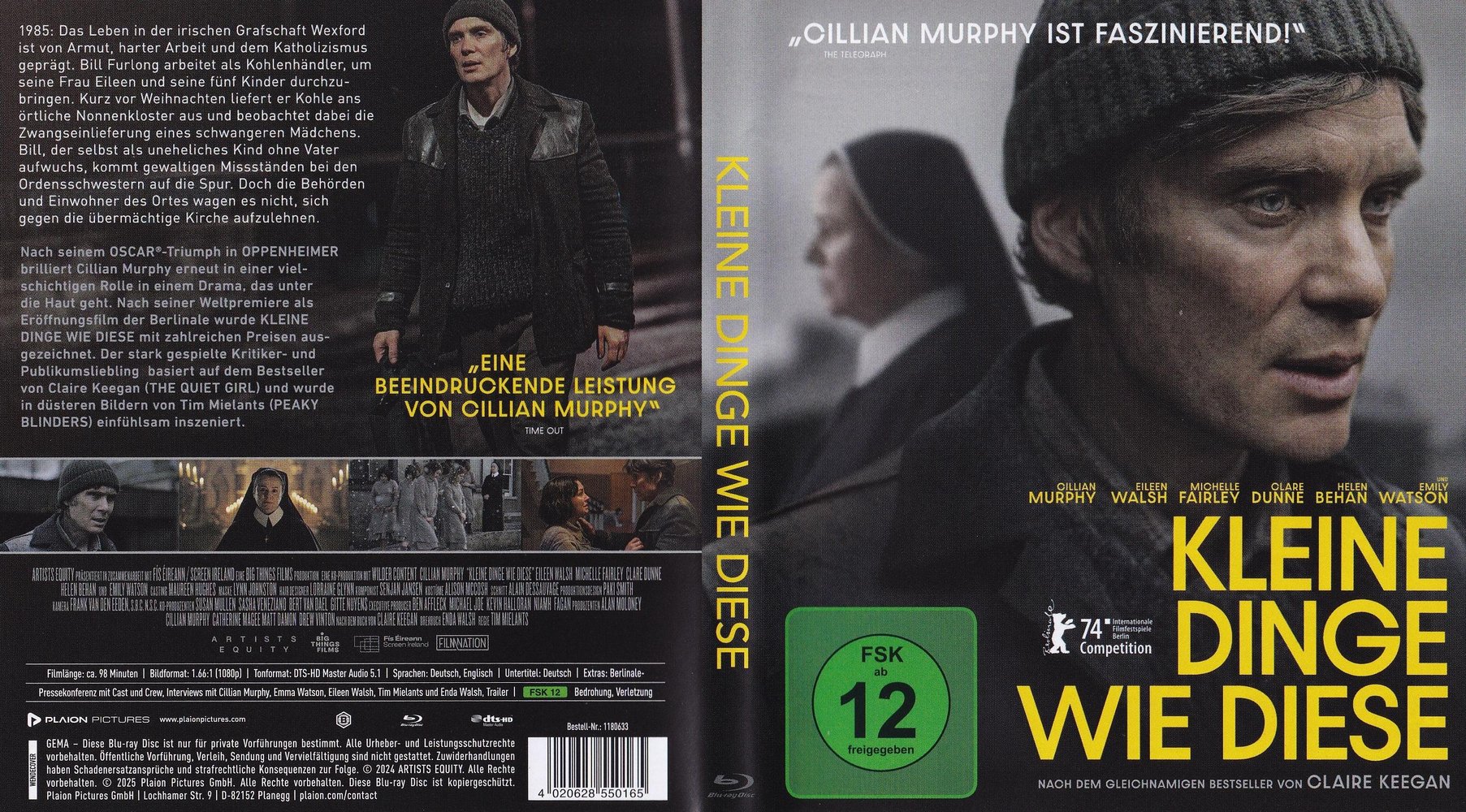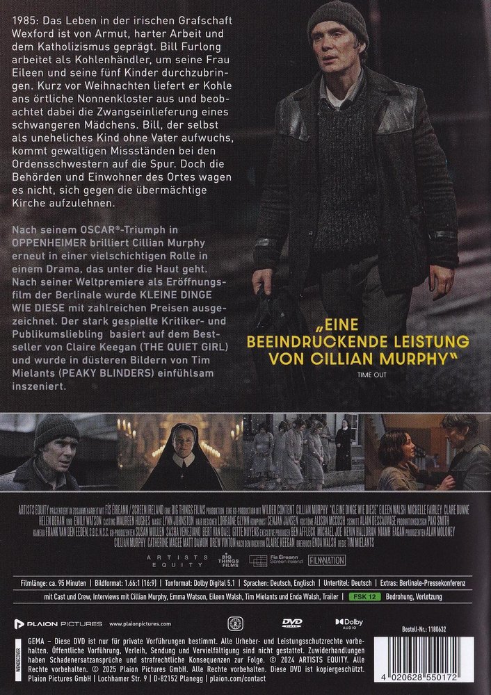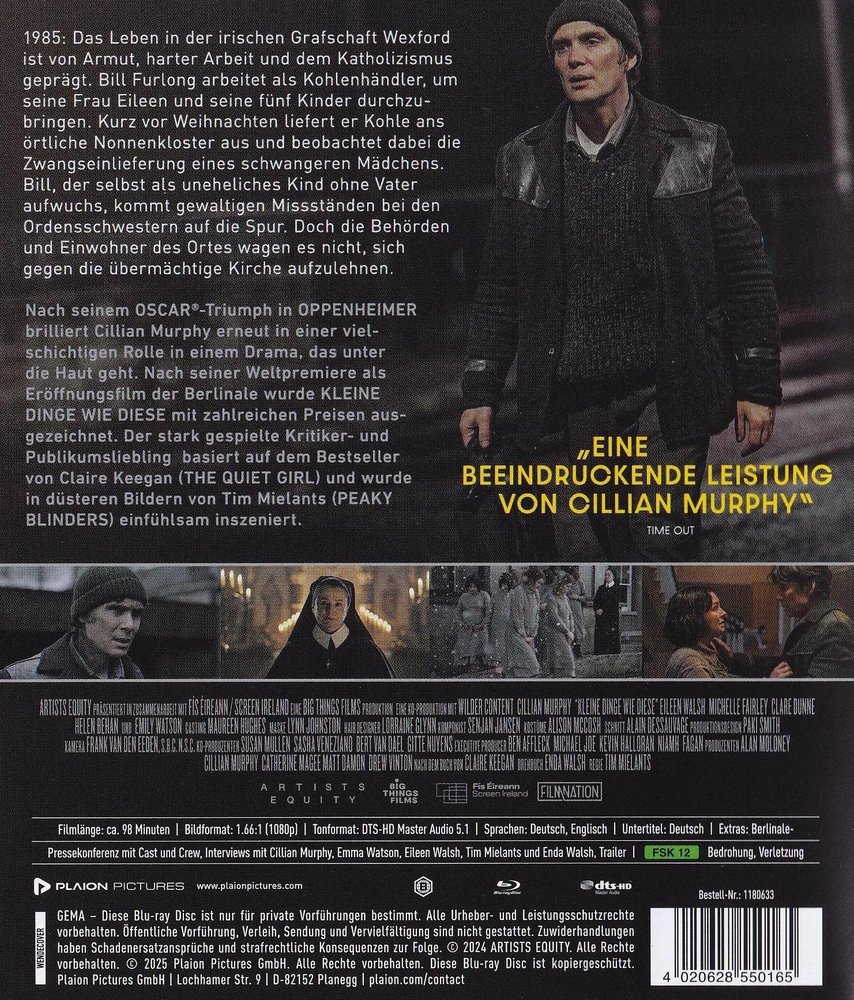 In 'Small Things Like These - Kleine Dinge wie diese' (2024), der irischen Romanverfilmung nach Autorin Claire Keegan unter der Regie von Tim Mielants, starbesetzt mit Cillian Murphy als Bill Furlong, Emily Watson als Sister Mary, Ciarán Hinds, Clare Dunne als Sister Carmel und Michelle Fairley als Mrs. Wilson, die in Deutschland am 15. Februar 2024 das 74. Berlinale-International-Filmfestival eröffnete. Nach seinem Oscar-Triumph in 'Oppenheimer' brilliert Murphy erneut in einer vielschichtigen Rolle in einem Drama, das unter die Haut geht. Nach seiner Weltpremiere als Eröffnungsfilm der Berlinale wurde 'Kleine Dinge wie diese' mit zahlreichen Preisen ausgezeichnet. Der stark gespielte Kritiker- und Publikumsliebling basiert auf dem Bestseller von Keegan und wurde in düsteren Bildern von Regisseur Mielants einfühlsam inszeniert.