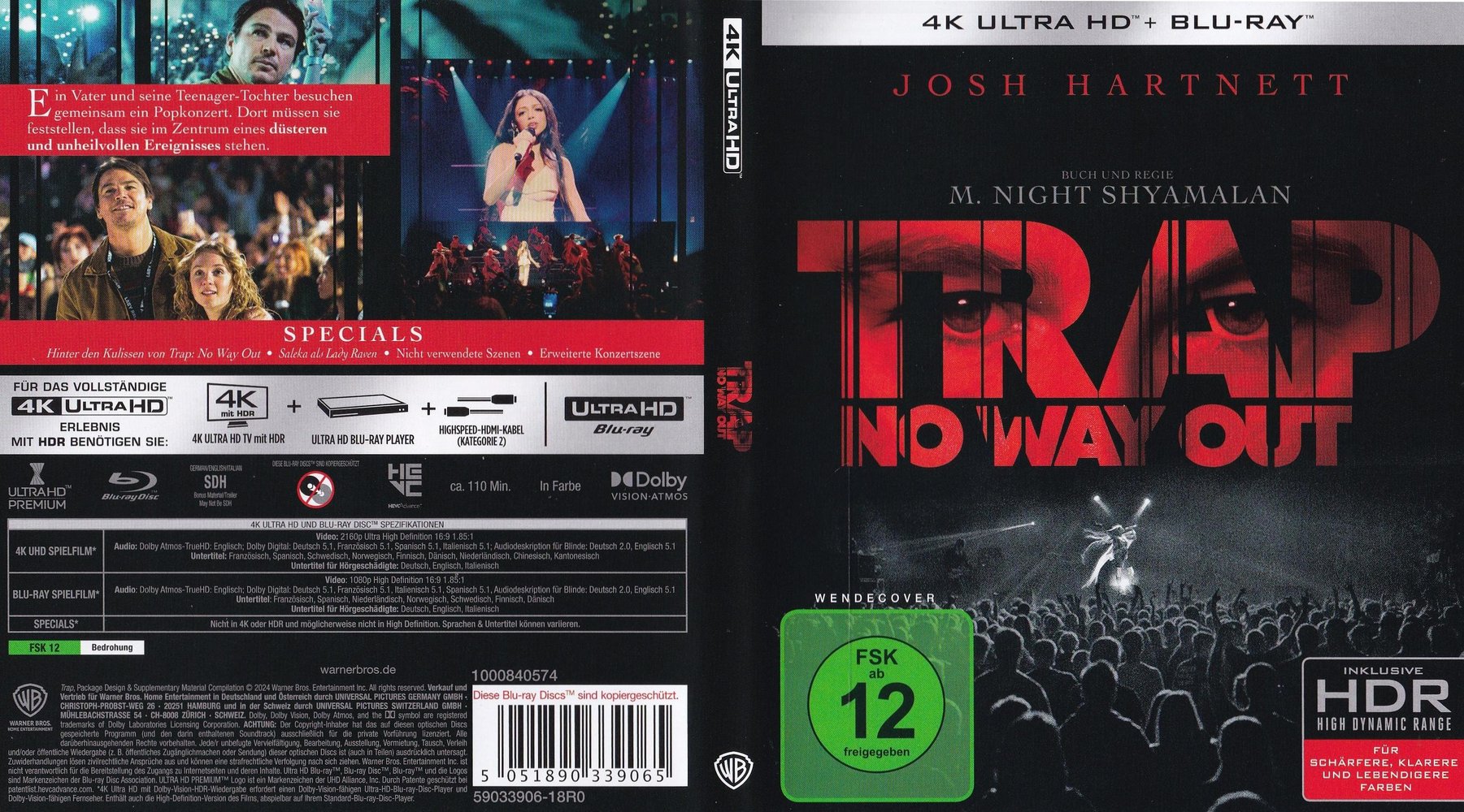 With 'Trap - No Way Out' (2024), the film studio 'Warner Bros. Pictures' presents a new experience in the fascinating world of M. Night Shyamalan. The cast includes the up-and-coming musician Saleka Shyamalan. The screenplay was written by M. Night, who also directed. The cast includes Josh Hartnett, Ariel Donoghue, Saleka Shyamalan, Hayley Mills and Alison Pill. The film was produced by Ashwin Rajan, Marc Bienstock and M. Night. The executive production was taken over by Steven Schneider. Sayombhu Mukdeeprom ('Call Me by Your Name') has been hired as cinematographer. The production design is by Debbie de Villa ('The Hating Game'). The editing was done by Noëmi Preiswerk, the film music was composed by Herdĭs Stefănsdŏttir (both 'Knock at the Cabin'). Susan Jacobs was involved as music supervisor, and Caroline Duncan (both 'Old') as costume designer. Douglas Aibel ('Asteroid City') was responsible for the casting. The studio 'Warner Bros. Pictures' presents a production of 'Blinding Edge Pictures'. 'Warner Bros.' took over worldwide distribution, the international film release in cinemas was reached on August 2, 2024, and in German cinemas the film started as early as August 1, 2024.