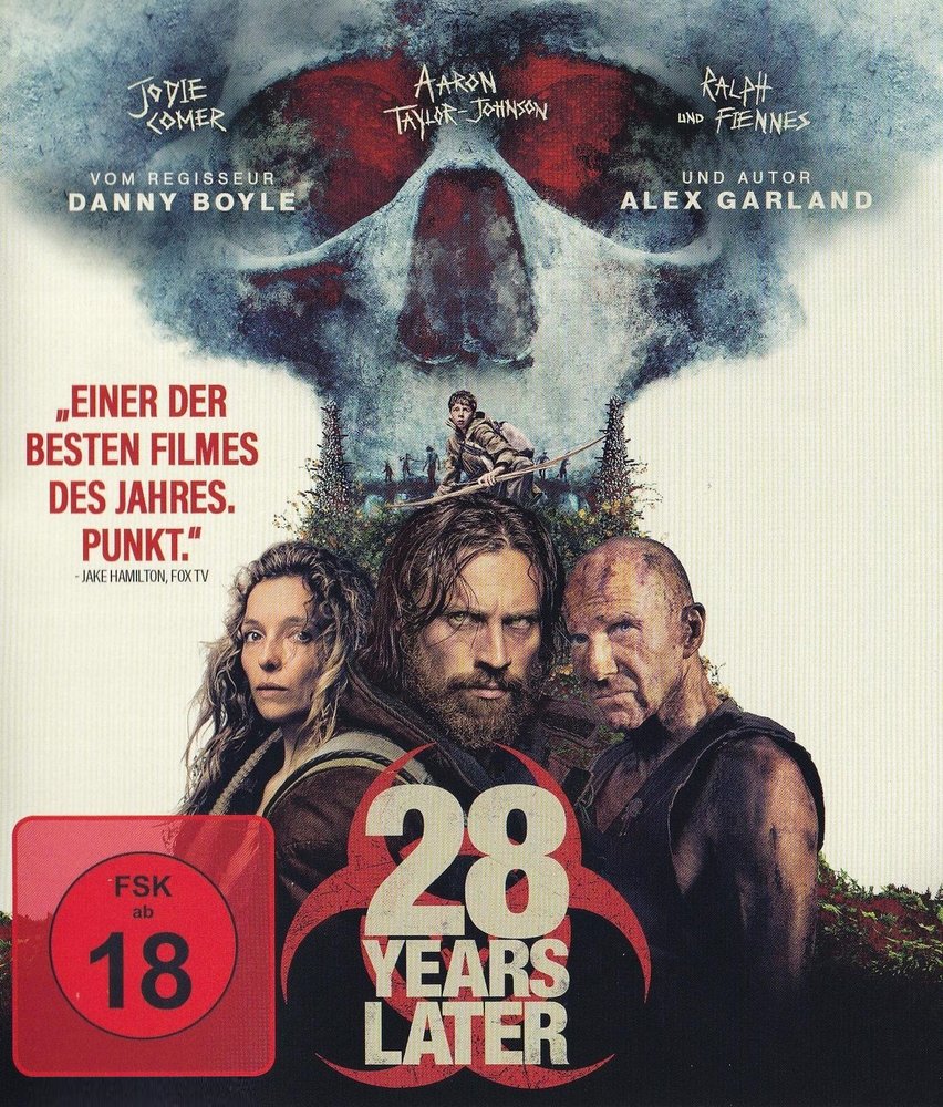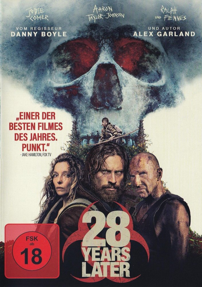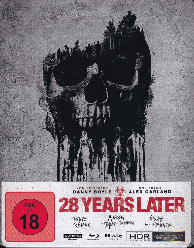 After the modern British apocalyptic classic '28 Days Later' (2002) and its sequel '28 Weeks Later' (2007), original director Danny Boyle ('Trainspotting') returns with the third part of the film series '28 Years Later' (2024). Oscar-winning director Boyle and Oscar-nominated screenwriter Alex Garland reunite here to tell a frightening new story set in the world of '28 Days Later'. The film was directed by Boyle ('Trainspotting') and written by Garland ('Civil War'). The film was produced by Andrew Macdonald, Peter Rice, Bernard Bellew, and Boyle and Garland. The executive producer was Cillian Murphy. The film stars Jodie Comer (from 'The Bikeriders'), Aaron Taylor-Johnson ('Kraven - The Hunter'), Ralph Fiennes ('Konklave'), Jack O'Connell ('Back to Black'), Alfie Williams ('His Dark Materials'), Emma Laird as Jimmima, Erin Kellyman as Jimmy Ink, Edvin Ryding as Erik Sundqvist and many other stars, at the cinema premiere in Germany on June 19, 2025 and the German home cinema release on DVD, Blu-ray and 4K UHD on September 25, 2025.