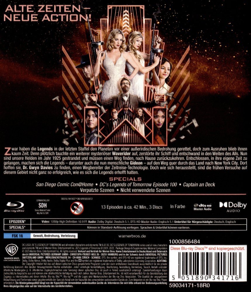 Alte Zeiten - Neue Action!Zwar haben die Legends in der letzten Staffel den Planeten vor einer außerirdischen Bedrohung gerettet, doch zum Ausruhen blieb ihnen kaum Zeit. Denn plötzlich tauchte ein weiterer mysteriöser Waverider auf, zerstörte ihr Schiff und entschwand in den Weiten des Alls. Nun sind unsere Helden im Jahr 1925 gestrandet und müssen einen Weg finden, nach Hause zurückzukehren. Entschlossen, in ihre eigene Zeit zu gelangen, machen sich die Legends - darunter auch die nun menschliche Gideon - auf den Weg quer durch das Land nach New York City. Dort hoffen sie, Dr. Gwyn Davis zu finden, einen Wegbereiter der Zeitreise-Technologie. Doch wie sich herausstellt, sind die frühen Versuche auf diesem Gebiet nicht ganz so erfolgreich, wie es sich die Legends erhofft hatten.Alle 13 Episoden auf 3 DiscsEpisodenübersicht- Ballernde Blondinen- Alle gegen Edgar- Willkommen im Team, Gideon- Showdown in der Flüsterkneipe- Du sollst mein Glücksstein sein- Deus Ex Latrina- Der Platz einer Frau- Paranoide Androiden- Drama, Baby!- Fixpunkt- Kampf gegen die Maschinen- Blick in die Zukunft- Gideon gegen Gideon