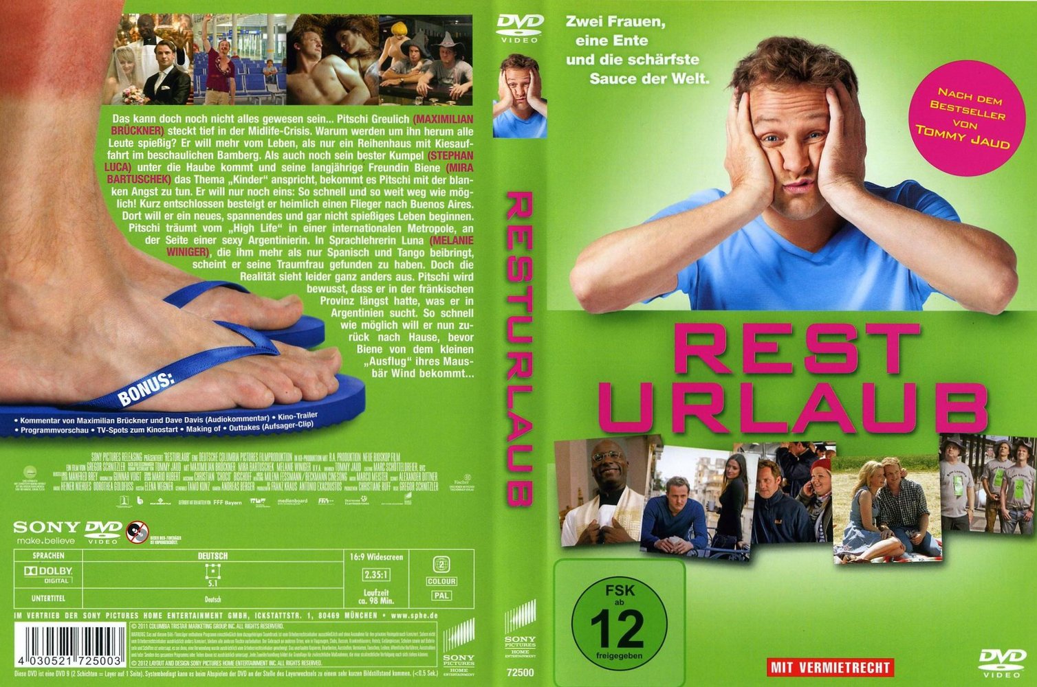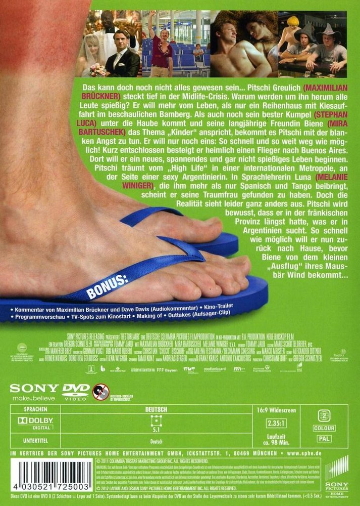 Auch wenn er es selber nicht wahrhaben will, Pitschi Greulich (Maximilian Brückner) steckt tief in der Midlife Crisis. Seine innovativen Marketingideen kommen bei seinem Chef nicht an; dass nun auch noch sein bester Freund heiraten will, trifft ihn schwer; und immer, wenn seine langjährige Freundin Sabine (Mira Bartuschek) das Thema 'Kinder' anspricht, steigt die blanke Angst in ihm hoch. Pitschi graut auch davor, zum elften Mal mit den gleichen Freunden in das gleiche Hotel auf Mallorca in Urlaub fahren zu müssen. Kurz vor dem Abflug ist es dann soweit: Pitschi hat mitten auf dem Nürnberger Flughafen eine Panikattacke und kurz darauf eine Eingebung: Er braucht dringend etwas Abstand vom miefigen Bamberg und dem geplanten Reihenhaus mit Kiesauffahrt. Kurz entschlossen lässt er seine Freunde nach einem Ablenkungsmanöver alleine nach Mallorca fliegen und besteigt selbst - etwas unüberlegt - einen Flieger nach Buenos Aires, Argentinien. Dort will er ein neues, spannendes und gar nicht spießiges Leben beginnen! Er träumt von einer schicken Penthouse-Wohnung und rassigen Südamerikanerinnen. Doch kaum in Buenos Aires angekommen, sieht die Realität leider ganz anders aus: Pitschi landet in einer WG mit einem Tierfriseur, spricht kaum Spanisch und die heißblütigen Latinas haben nur Augen für andere Männer. Pitschi wird schmerzlich bewusst, dass er daheim in Bamberg genau das hatte, was er in Argentinien verzweifelt sucht! So schnell wie möglich will Pitschi nun zurück nach Hause, bevor die immer noch nichtsahnende Sabine aus Mallorca zurückkehrt und von seinem kleinen 'Ausflug' Wind bekommt... 'Resturlaub' (2011) ist nach 'Friendship!' das zweite Projekt der Deutschen Columbia-Pictures-Filmproduktion und basiert auf dem gleichnamigen Bestseller von Tommy Jaud, der auch das Drehbuch schrieb. Die Hauptrollen in dieser spritzigen Komödie spielen Maximilian Brückner ('Tatort', 'Schwere Jungs', 'Wer früher stirbt, ist länger tot') als Brauerei-Manager Peter 'Pitschi' Greulich und Mira Bartuschek als seine bessere Hälfte 'Biene'. Stephan Luca ('Keinohrhasen') ist als Pitschis bester Freund Arne zu sehen, Martina Hill ('Switch Reloaded') als Biggy-Ente und Antoine Monot ('Männerherzen', 'Der Wixxer') als Checko. Die Schweizerin Melanie Winiger verdreht als heißblütige Argentinierin Luna Pitschi gehörig den Kopf. Regie führt Gregor Schnitzler ('Die Wolke', 'Soloalbum', 'Was tun, wenn's brennt?').