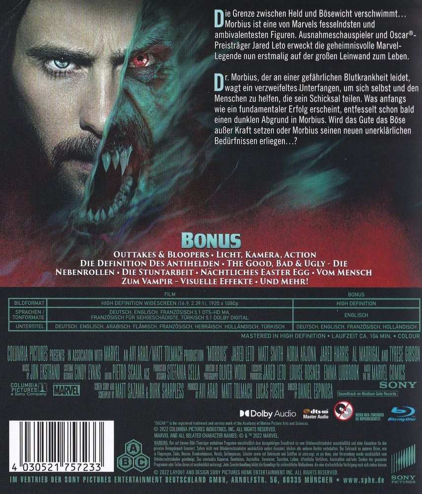 Die Grenze zwischen Held und Bösewicht verschwimmt. 'Morbius' ist eine von 'Marvels' fesselndsten und ambivalentesten Figuren. Ausnahmeschauspieler und Oscar-Preisträger Jared Leto erweckt die geheimnisvolle Marvel-Legende nun erstmalig zum Leben. Dr. Morbius, der an einer gefährlichen Blutkrankheit leidet, wagt ein verzweifeltes Unterfangen, um sich selbst und den Menschen zu helfen, die sein Schicksal teilen. Was anfangs wie ein fundamentaler Erfolg erscheint, entfesselt schon bald einen dunklen Abgrund in Morbius. Wird das Gute das Böse außer Kraft setzen oder Morbius seinen neuen unerklärlichen Bedürfnissen erliegen? In 'Morbius' (2022) verkörpert Leto (zuletzt u.a. in 'Blade Runner 2049') eindrucksvoll eine der geheimnisvollsten Figuren im Marvel-Universum. In dem lang erwarteten Kinoereignis spielen unter der Regie des Visionärs Daniel Espinosa (siehe seinen Science-Fiction-Tipp 'Life' hier im Verleihprogramm) in weiteren Rollen Matt Smith ('Doctor Who') als ehemaliger Verbündeter sowie Tyrese Gibson (aus der 'Fast & Furious' Reihe) als FBI-Agent und Verfolger des verwandelten Dr. Morbius. Adria Arjona ('Pacific Rim 2 - Uprising') und Jared Harris ('Chernobyl') komplettieren den hochkarätigen Cast. Basierend auf der Geschichte von Roy Thomas ('Captain Marvel') und den Figuren von Gil Kane ('Green Lantern'), stammt das Drehbuch aus den Händen des Duos Matt Sazama und Burk Sharpless (schrieben zuletzt die Serie 'Lost in Space'). Nach 'Venom', 'Spider-Man - Far From Home' und 'Spider-Man - Homecoming' produzierten Avi Arad und Matt Tolmach erstmals gemeinsam mit Louise Rosner ('Die Tribute von Panem' Reihe) und Lucas Foster ('Jumper'). Der Kinostart in Deutschland war am 31. März 2022 erreicht, der deutsche Heimkinostart auf DVD, Blu-ray und 4K UHD Blu-ray am 23. Juni 2022.