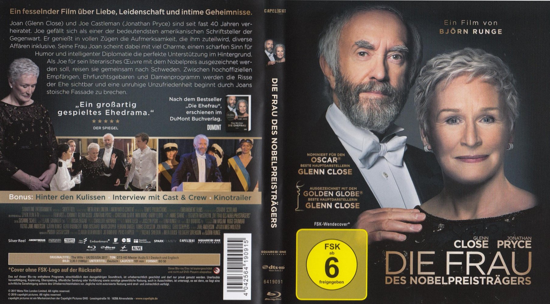 Die Ehefrau Joan (Glenn Close) und ihr Mann Joe Castleman (Jonathan Pryce) sind seit fast 40 Jahren verheiratet. Joe gefällt sich als einer der bedeutendsten amerikanischen Schriftsteller der Gegenwart. Er genießt in vollen Zügen die Aufmerksamkeit, die ihm zu Teil wird, diverse Affären inklusive. Seine Frau Joan scheint dabei mit viel Charme, einem scharfen Sinn für Humor und intelligenter Diplomatie die perfekte Unterstützung im Hintergrund. Als Joe für sein literarisches Oeuvre mit dem Nobelpreis ausgezeichnet werden soll, reisen sie gemeinsam nach Schweden. Begleitet werden sie dabei von ihrem Sohn David (Max Irons), selbst angehender Schriftsteller ohne Vaters Segen. Zwischen hochoffiziellen Empfängen, Ehrfurchtsgebaren und Damenprogramm werden die Risse der Ehe sichtbar und eine unruhige Unzufriedenheit beginnt durch Joans stoische Fassade zu brechen. Zu allem Überfluss werden die Castlemans auch noch von Journalist und Möchtegern-Biograph Nathaniel Bone (Christian Slater) verfolgt, der unnachgiebig versucht, ein dunkles Geheimnis aufzudecken... Eine Klasse für sich: Die sechsfach Oscar-nominierte Hollywood-Ikone Glenn Close (siehe u.a. 'Albert Nobbs', 'Gefährliche Liebschaften' oder 'Eine verhängnisvolle Affäre'), die kürzlich für ihre herausragende schauspielerische Leistung in 'Die Frau des Nobelpreisträgers' alias 'The Wife' mit dem Hollywood-Actress-Award ausgezeichnet wurde, beweist als perfekte Literaten-Gattin Joan Castleman hier einmal mehr, wie einzigartig und intensiv ihr nuanciertes Spiel ist. Ihr zur Seite steht mit BAFTA-Gewinner Jonathan Pryce (aus 'The Man Who Killed Don Quixote', 'Game of Thrones', und 'Fluch der Karibik') ein nicht minder facettenreicher Partner, der eine beindruckende Performance als ihr Ehemann Joe abliefert. Die Nebenrollen sind ebenfalls stark besetzt: Christian Slater ('Mr. Robot', 'Nymphomaniac', 'Bobby') ist als Enthüllungsjournalist Nathaniel Bone zu sehen, Max Irons ('Die Frau in Gold', 'Seelen', 'Red Riding Hood') spielt Sohn David Castleman, die junge Joan Castleman wird von Glenn Closes Tochter Annie Starke (sie waren bereits gemeinsam in 'Albert Nobbs' zu sehen) überzeugend dargestellt. Mit diesem hochkarätigen Ensemble und in einer dichten, atmosphärischen Inszenierung bringt der schwedische Filmemacher und Gewinner des 'Silbernen Bären' Björn Runge ('Daybreak') nun mit 'Die Frau des Nobelpreisträgers' den gleichnamigen Roman der US-Autorin Meg Wolitzer (deutsche Ausgabe 'Die Ehefrau', erschienen im Dumont-Buchverlag) auf die Leinwand und anschließend hier ins Verleihprogramm. Die scharfen und pointierten Dialoge stammen aus der Feder von Drehbuchautorin Jane Anderson ('Ein amerikanischer Quilt').
