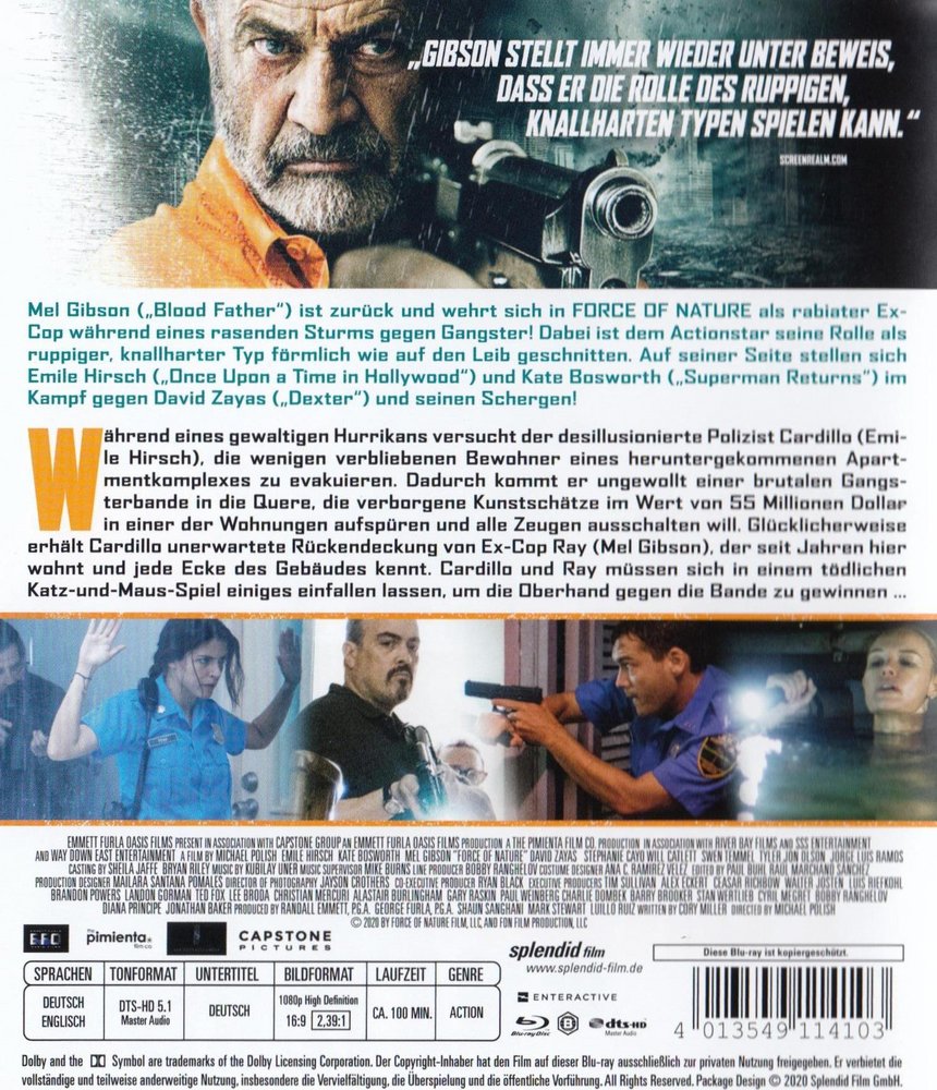 Mel Gibson spielt in dem Actionthriller 'Force of Nature' (2020) unter der Regie von Michael Polish den pensionierten Detective Ray, während sich ein heftiger Hurrikan der Kategorie 5 zusammenbraut. Als der unerfahrenere Cop Cardillo (Emile Hirsch aus 'Into the Wild') einen Wohnkomplex evakulieren soll, stößt er mit Dr. Troy (Kate Bosworth) und ihren Vater Ray zusammen: Während eines gewaltigen Hurrikans versucht der desillusionierte Polizist Cardillo (Hirsch), die wenigen verbliebenen Bewohner eines heruntergekommenen Apartmentkomplexes zu evakuieren. Dadurch kommt er ungewollt einer brutalen Gangsterbande in die Quere, die verborgene Kunstschätze im Wert von 55 Millionen Dollar in einer der Wohnungen aufspüren und alle Zeugen ausschalten will. Glücklicherweise erhält Cardillo unerwartete Rückendeckung von Ex-Cop Ray (Gibson), der seit Jahren hier wohnt und jede Ecke des Gebäudes kennt. Cardillo und Ray müssen sich in einem tödlichen Katz-und-Maus-Spiel einiges einfallen lassen, um die Oberhand gegen die Bande zu gewinnen... Mel Gibson ('Blood Father') ist zurück und wehrt sich in 'Force of Nature - Wer Wind sät, wird Sturm ernten' (2020) als rabiater Ex-Cop während eines rasenden Sturms gegen Gangster. Dabei ist dem Actionstar seine Rolle als ruppiger, knallharter Typ förmlich wie auf den Leib geschnitten. Auf seiner Seite stellen sich Emile Hirsch ('Once Upon a Time in Hollywood') und Kate Bosworth ('Superman Returns') im Kampf gegen David Zayas ('Dexter') und seinen Schergen.